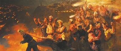1959年,新中国成立10周年、中国革命博物馆落成时,27岁的蔡亮应邀担纲主题为“延安军民欢庆抗日战争胜利”的革命历史题材创作,由此诞生了红色经典油画《延安火炬》(见图)。作者将画面定格于胜利消息传来的欢乐夜晚,深情描述延安的漫山星火,通过火炬的光流、锣鼓唢呐的声浪、人群的动姿,把原本分散的欢庆元素汇聚在一起,淋漓尽致地展现了中国人民14年浴血奋战后终于迎来胜利的狂喜,将抗战胜利转化为具象可感的全民狂欢仪式,成为时代的记录。
