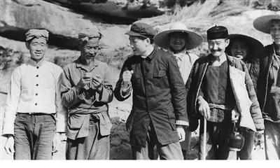 纪录片首次公开照片《毛泽东在杨家岭和陕北农民亲切交谈》。