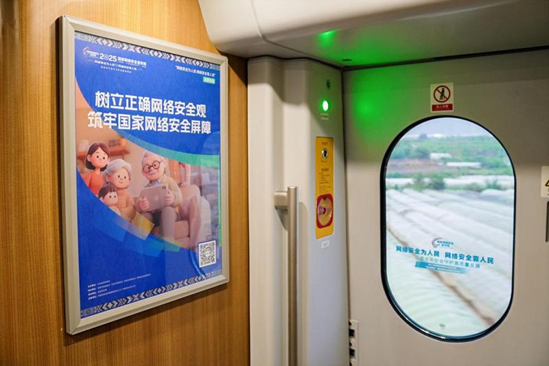 “网络安全为人民 网络安全靠人民”主题车厢,搭配《网络安全口诀要牢记》顺口溜,将日常安全知识转化为易懂易记的内容,让“网络安全靠人民”从口号落地为简单易操作的生活习惯。“以高水平安全守护高质量发展”主题车厢,以2025年国家网络安全宣传周活动主题为核心内容,重点传递“安全是发展的前提,发展是安全的保障”这一发展理念,引导乘客树立正确的“网络安全观”。“网络空间命运共同体”主题车厢,宣传构建网络空间命运共同体的“四项原则”和“五点主张”,倡导平等尊重、开放共享、和平安全的网络空间治理理念。