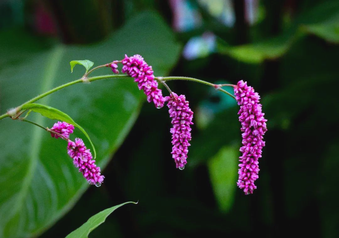 红蓼,最高能长到三米多,简直就是一棵小树的规模;碎花朵,米粒般簇成流苏般的穗儿,细瞧,像染了胭脂的狗尾巴花。