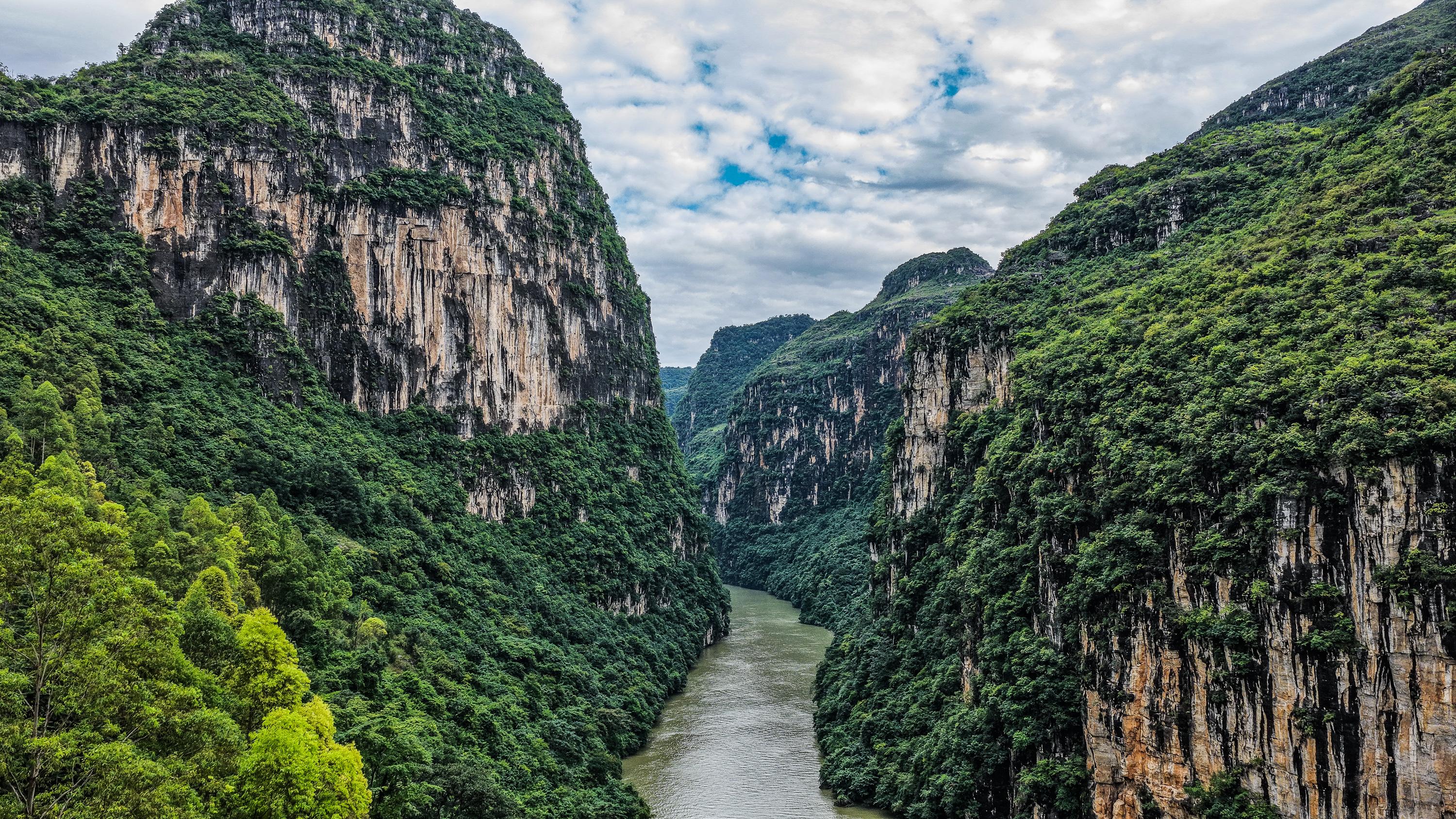 秋日时节,贵州省安顺市关岭布依族苗族自治县花江大峡谷景区风景秀美,岩壁、峡谷、河流构成一幅壮丽的画卷。