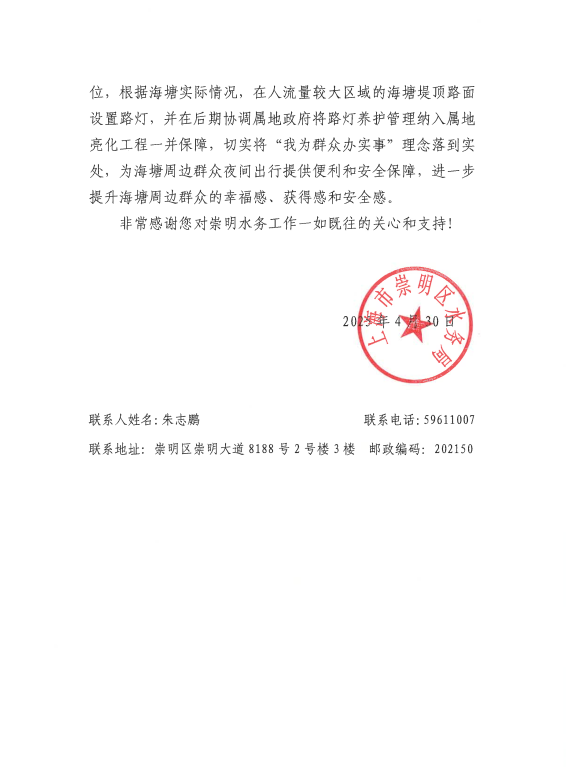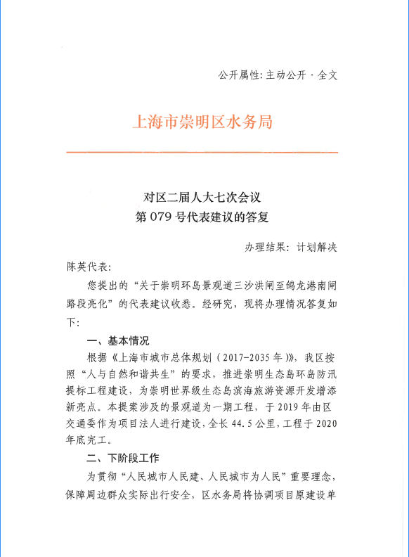崇明环岛景观道三沙洪闸至鸽龙港南闸路段已建成好几年了,自建成后,江边美景吸引了很多群众,成了大家茶余饭后、遛娃休闲、跑步健身的好去处。然而,由于该路段是黑色柏油路,且没有路灯,一旦天色变黑,来往车辆人员视线可视距离受限,导致群众出行存在安全隐患,周边群众要求安装路灯的呼声很高。对此,在今年1月召开的区二届人大七次会议上,她提出了《关于崇明环岛景观道三沙洪闸至鸽龙港南闸路段亮化的建议》书面建议。区水务局高度重视,表示将积极协调相关部门计划予以解决。