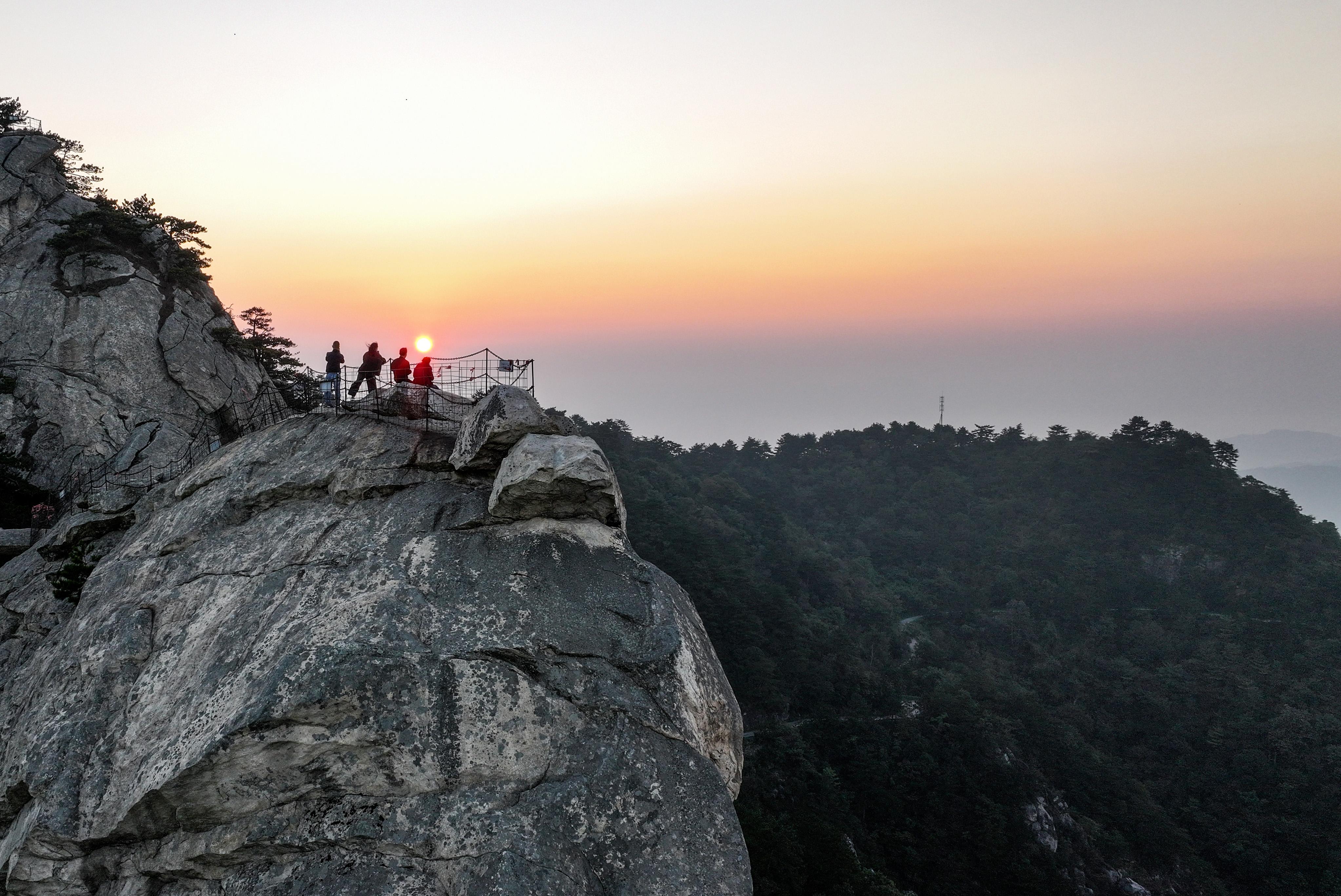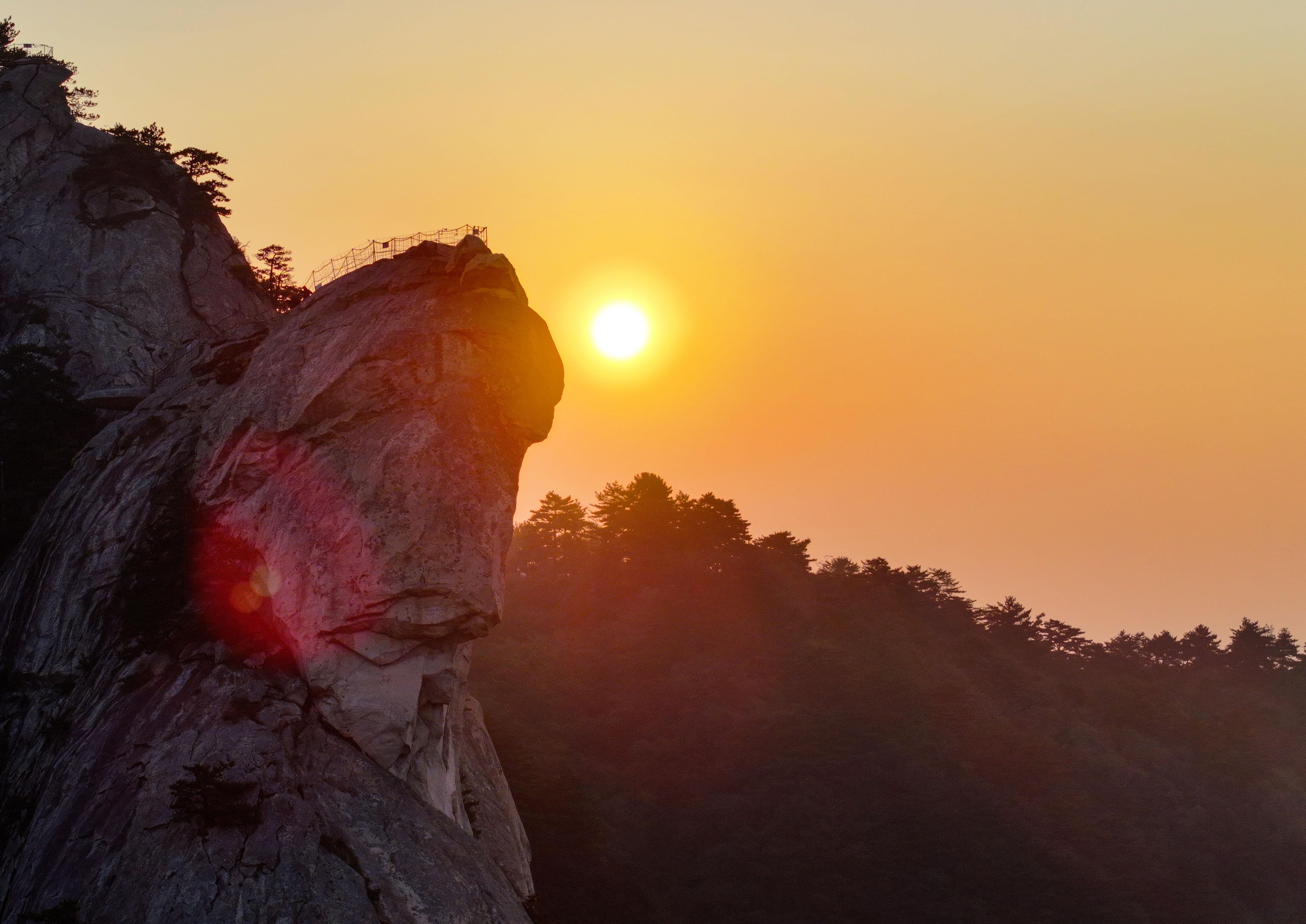 秋日清晨,初升的太阳照在湖北省麻城市龟峰山景区的奇峰怪石上,勾勒出“龟峰旭日”的壮丽景象。