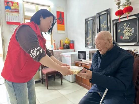 合作化南路社区助餐点志愿者上门为老人送来热乎的饭菜。