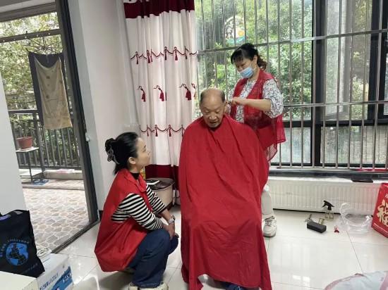 蜀山好人、金湖社区爱心理发志愿服务队队长许银芳上门为行动不便的老人理发。