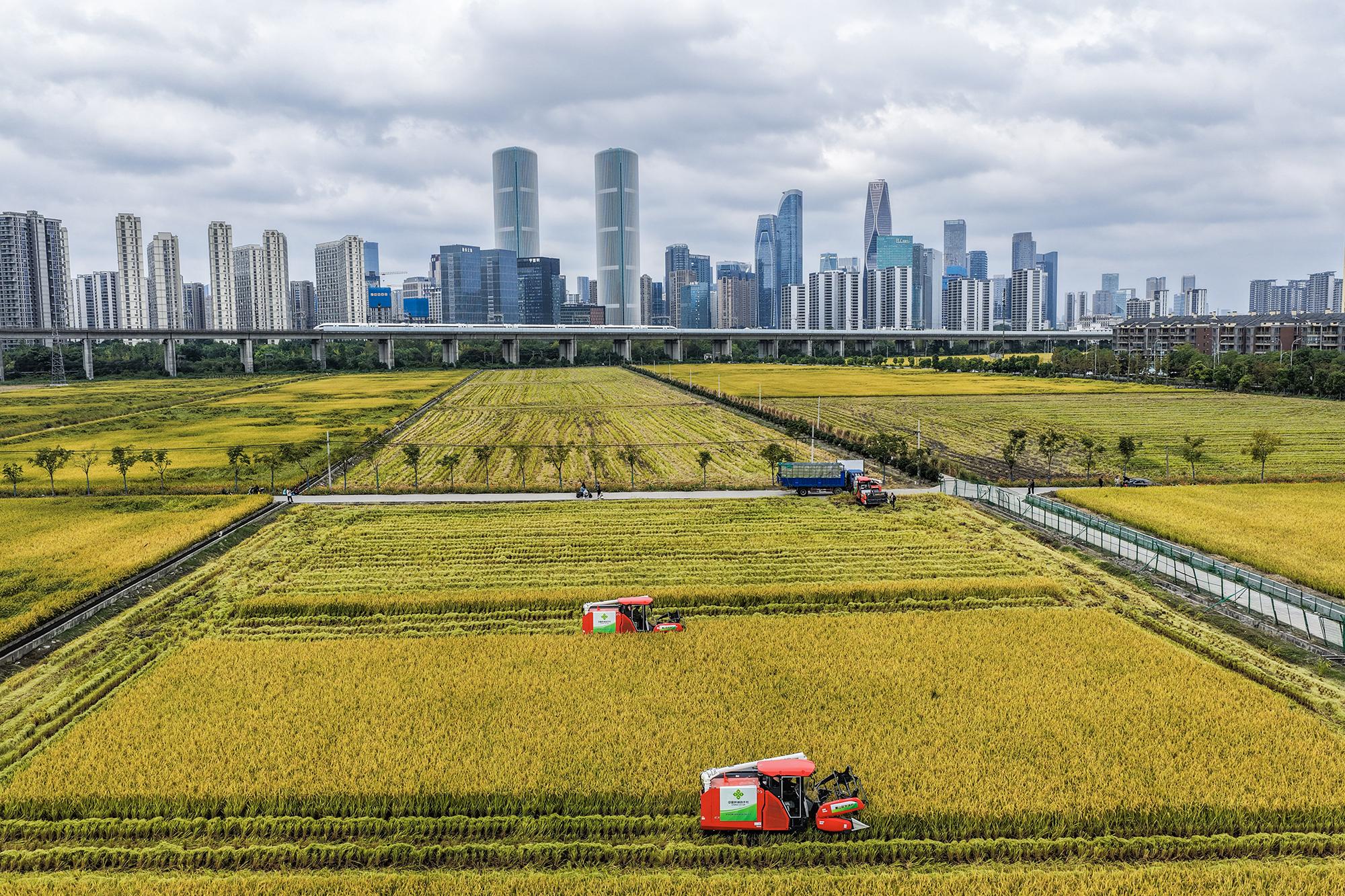 金秋时节,位于浙江杭州萧山区世纪田园粮食功能区的3000多亩水稻迎来丰收,金黄的稻田、飞驰而过的高铁列车和远处的城市天际线构成了独特的城市田园画卷。