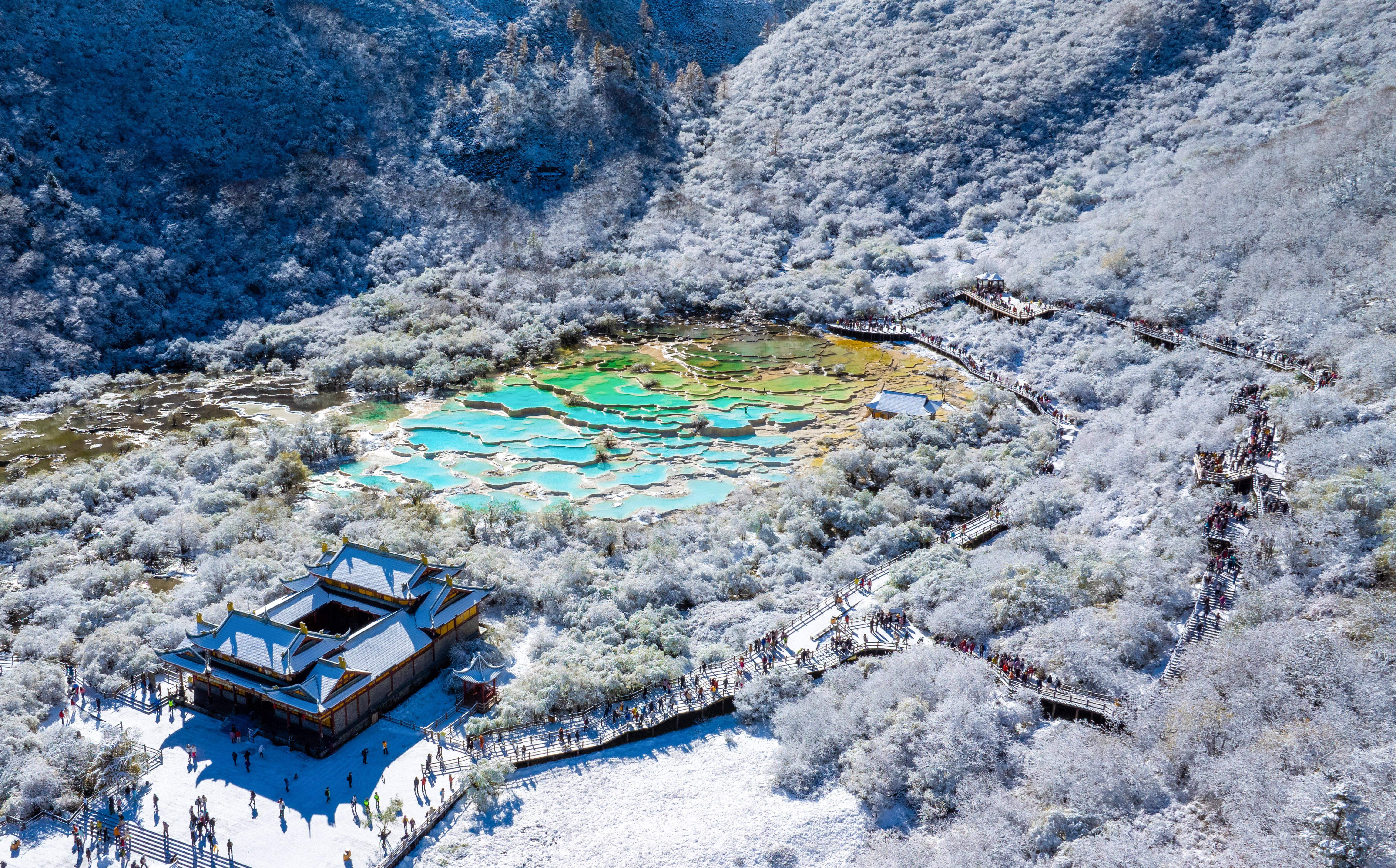 10月21日,四川省阿坝藏族羌族自治州黄龙景区迎来今秋第一场降雪,五彩池与皑皑白雪交相辉映,美不胜收。