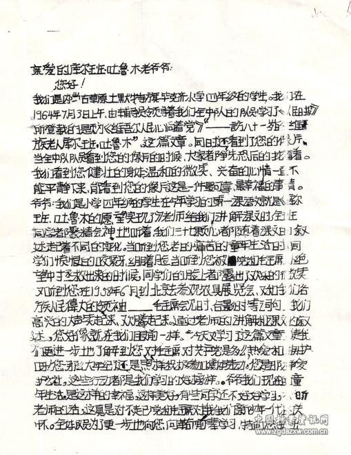 库尔班在苦难中挣扎的悲惨过往,跨越时空,引发了学生们的情感共鸣。1964年7月4日,内蒙古土默特旗毕克齐四校第三中队全体队员致信库尔班:“我们是小学四年级的学生,在今年学习的第一课语文就是《库尔班·吐鲁木的愿望实现了》。老师给我们讲解课文时,全班同学都聚精会神地听着,我们三十七颗心都随着课文的叙述起着不同的变化。当听到您老的痛苦的童年生活时,同学们愤恨的(地)咬紧牙、绷着脸……”通过课文中的描述,孩子们仿佛身临其境般体会到库尔班所遭受的剥削和压迫。