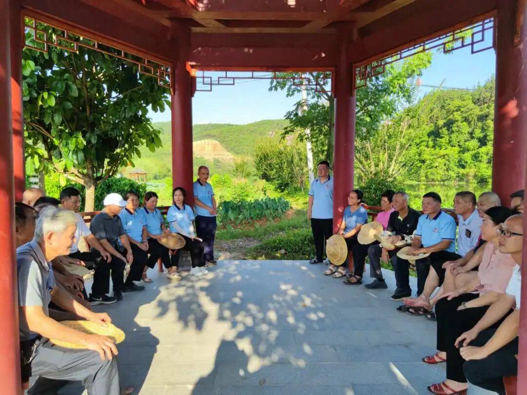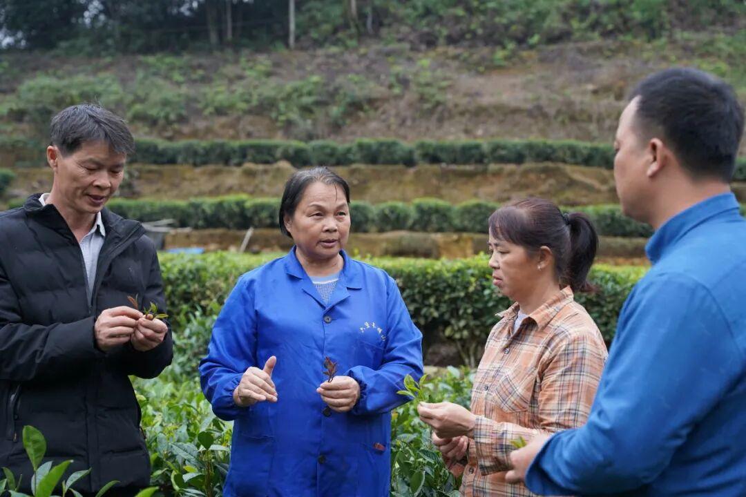梧州市人大代表、六堡茶制作技艺非遗传承人谭爱云(左二)向茶农传授种茶技术