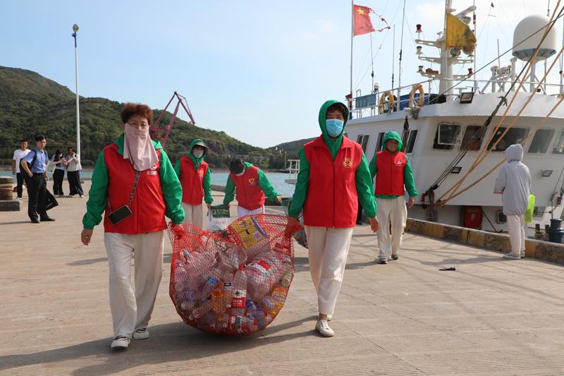 浙江舟山“东海渔嫂”巡逻队活跃在海岸线上,深入开展海上垃圾回港分类行动。袁浩程摄