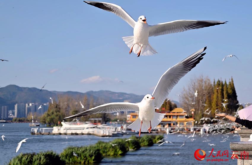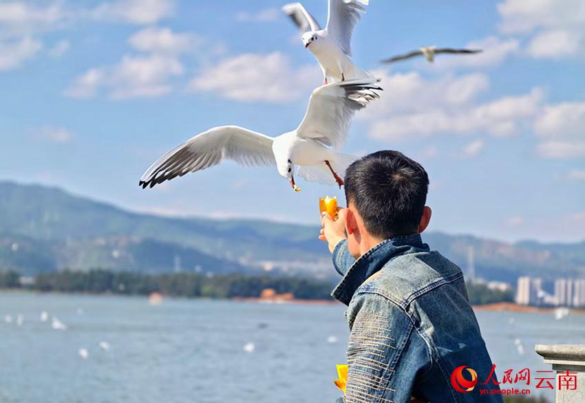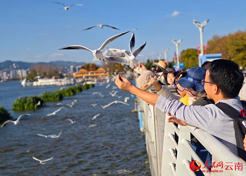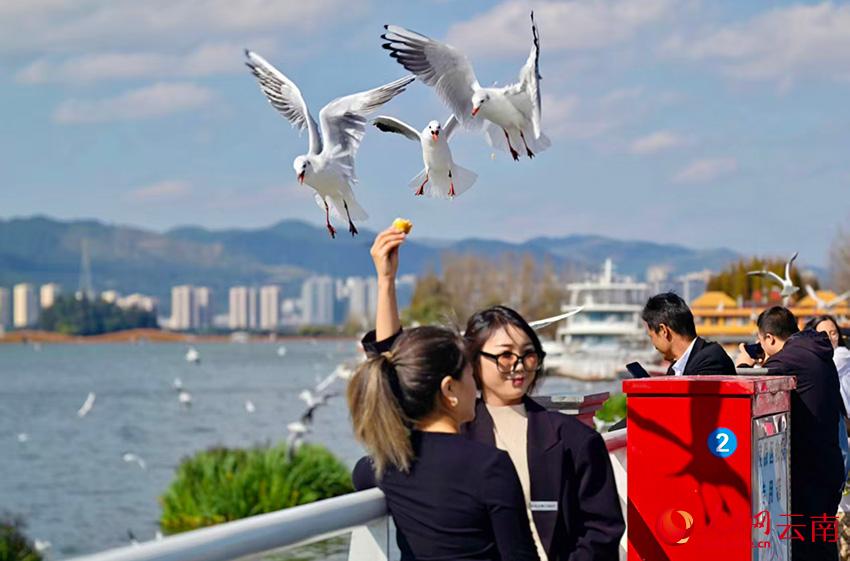 进入11月,云南省昆明市又一次迎来“老朋友”红嘴鸥,开启一年一度的观鸥季。在海埂大坝,红嘴鸥在滇池上空盘旋飞舞,水面倒映晴空,远处西山如黛。市民游客沿着海埂大坝漫步,或伸手喂食,或举手机拍摄,欢笑声与海鸥鸣叫交织成初冬春城最动听的乐章。