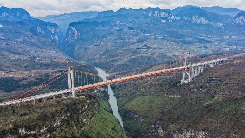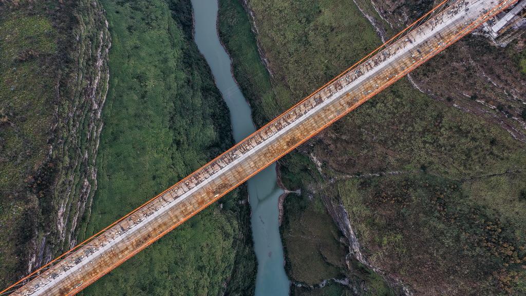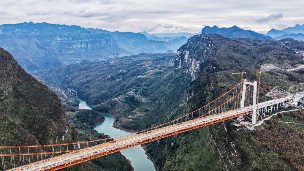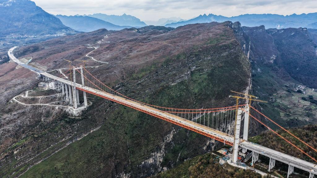 近日,贵州安(安顺)盘(盘州)高速天门特大桥主体工程顺利完工。天门特大桥是安顺至盘州高速公路的重要控制性工程,大桥全长1553米,桥面距离峡谷水面约560米。新华社记者 陶亮 摄
