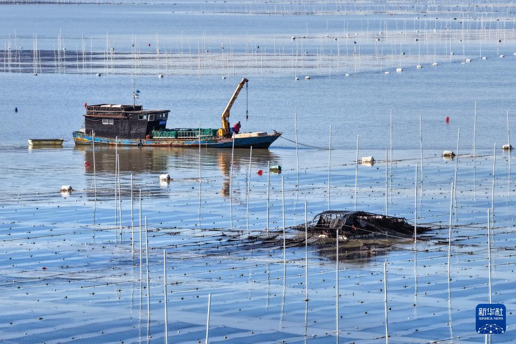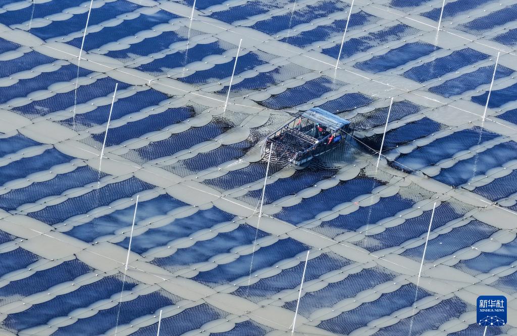 1月8日,渔民在江苏连云港市海州湾渔场养殖区收获条斑紫菜(无人机照片)。
