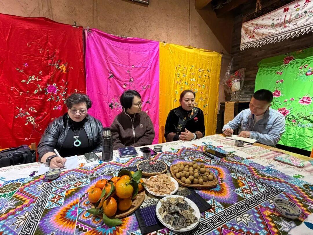 △2025年11月14日,巴莫曲布嫫(左二)在云南省大理白族自治州大理市喜洲镇周城村访谈白族刺绣市级代表性传承人杨美池。