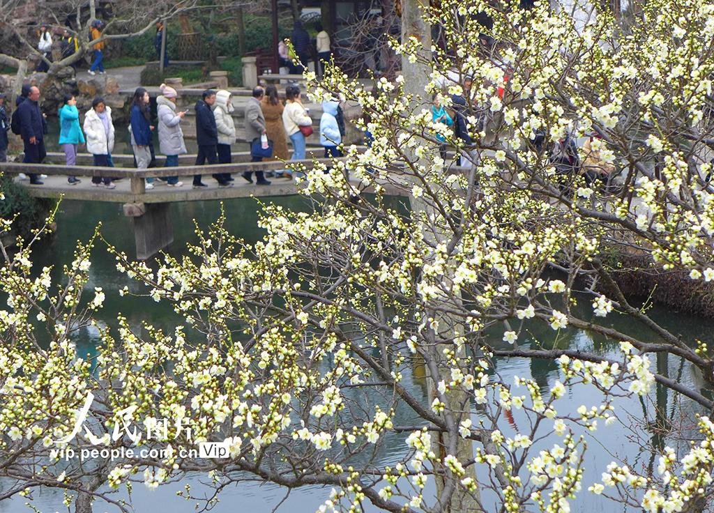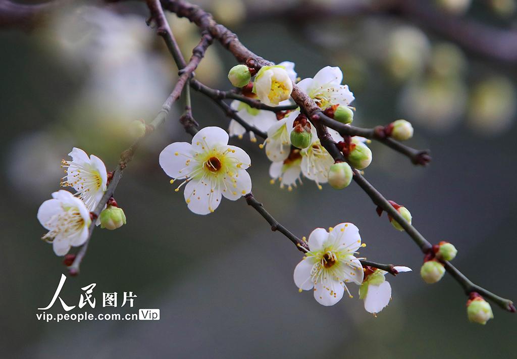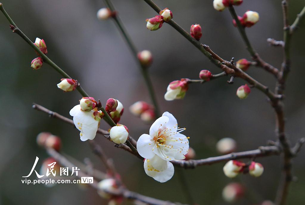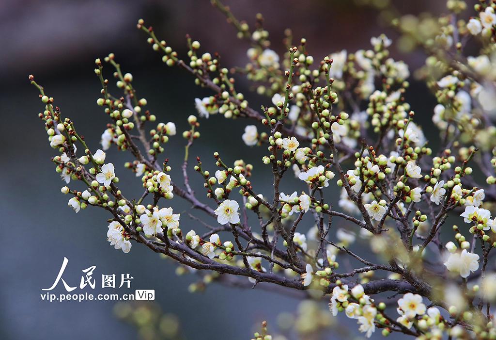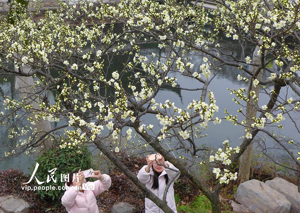 2026年1月27日,江苏苏州古典园林拙政园内一株株早春红梅、绿梅及粉白色梅花含苞欲放,争奇斗艳。王建中摄(人民图片网)
