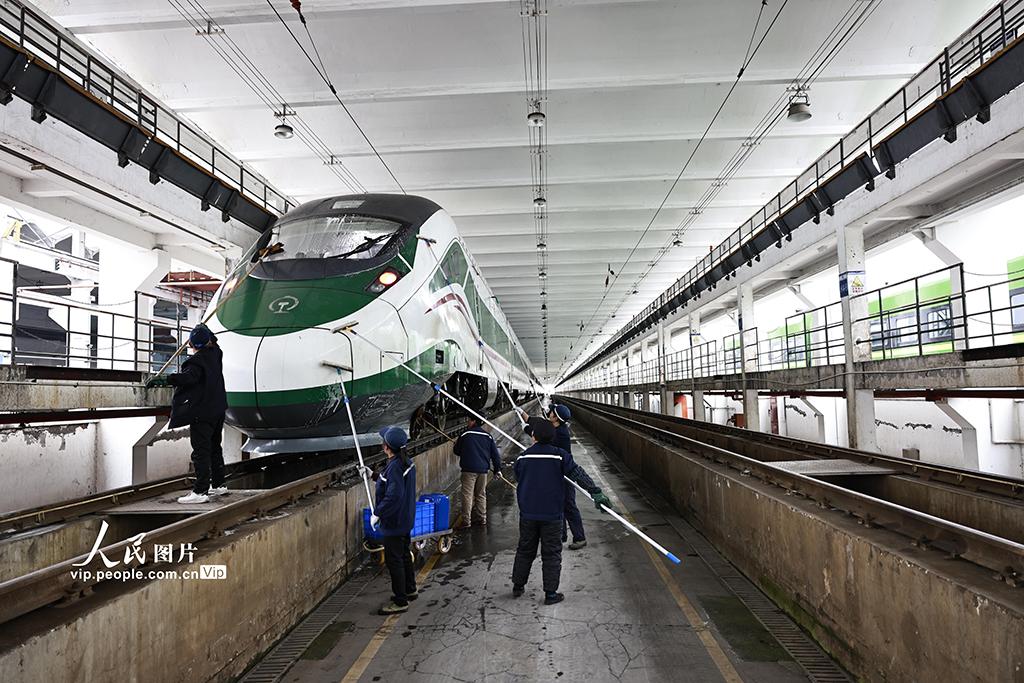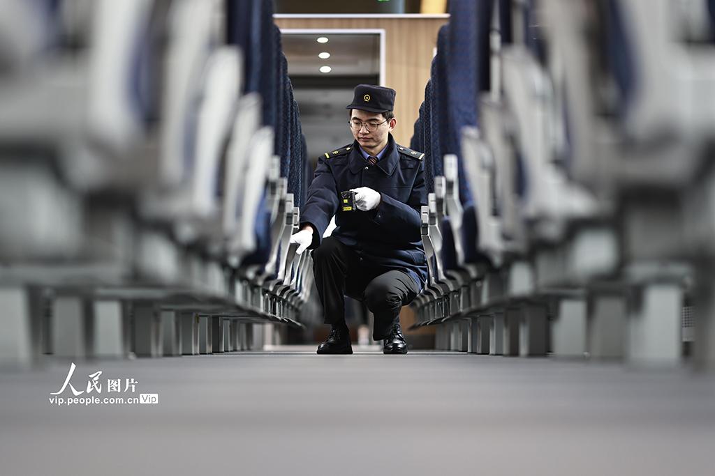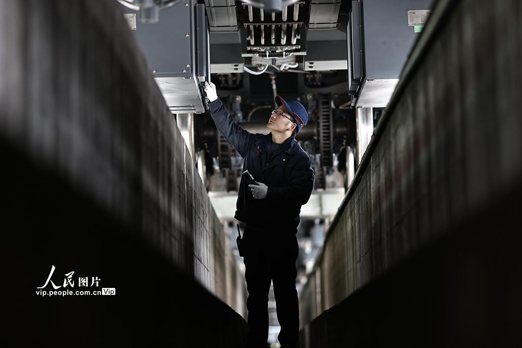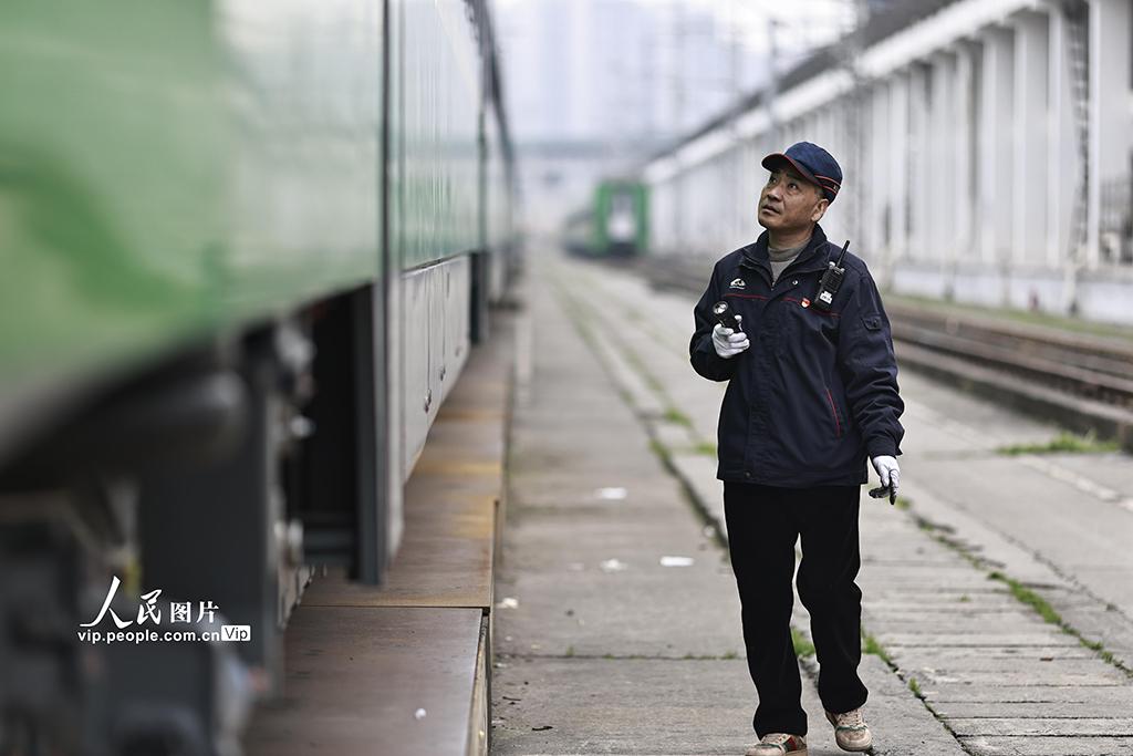 2026年1月29日,春运临近,中国铁路成都局集团有限公司重庆车辆段重庆北动集运用车间组织检修人员,对配属的CR200J动车组及普速列车的上部服务设施、下部走行、悬挂、钩缓、电气等关键系统进行全面整备,确保2026年春运安全运行。苏志刚摄(人民图片网)