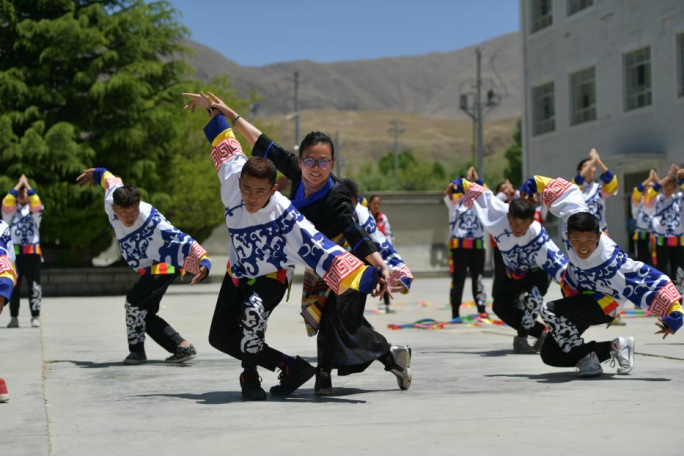 马丹老师发现藏区学生普遍具有能歌善舞的天赋,但课业压力较大,美育教育相对薄弱。为此,她克服重重困难在学校组建舞蹈啦啦操社团。她利用休息时间,深入基层采风学习,她来到藏戏传承村扎西曲登村,学习传统藏戏扎西雪巴;她跟着山南市群艺馆的老师和桑叶镇的村民,学习打阿嘎、锅庄舞;她请西藏大学的泽吉老师教授非物质文化遗产热巴舞蹈。在融汇传统与现代的基础上,她反复打磨,为学生精心创编了独具藏族特色的啦啦操,让优秀传统文化在校园绽放异彩。这套充满活力的啦啦操,迅速成为孩子们最喜爱的课间活动。