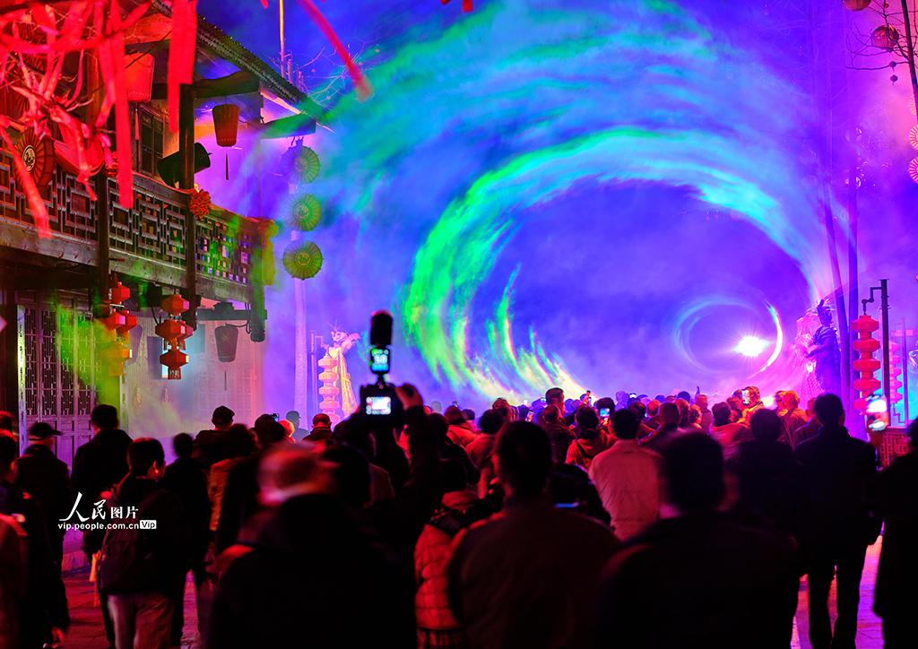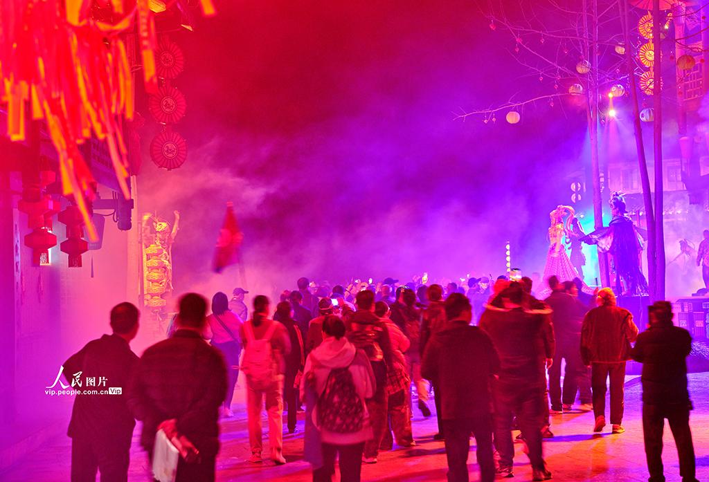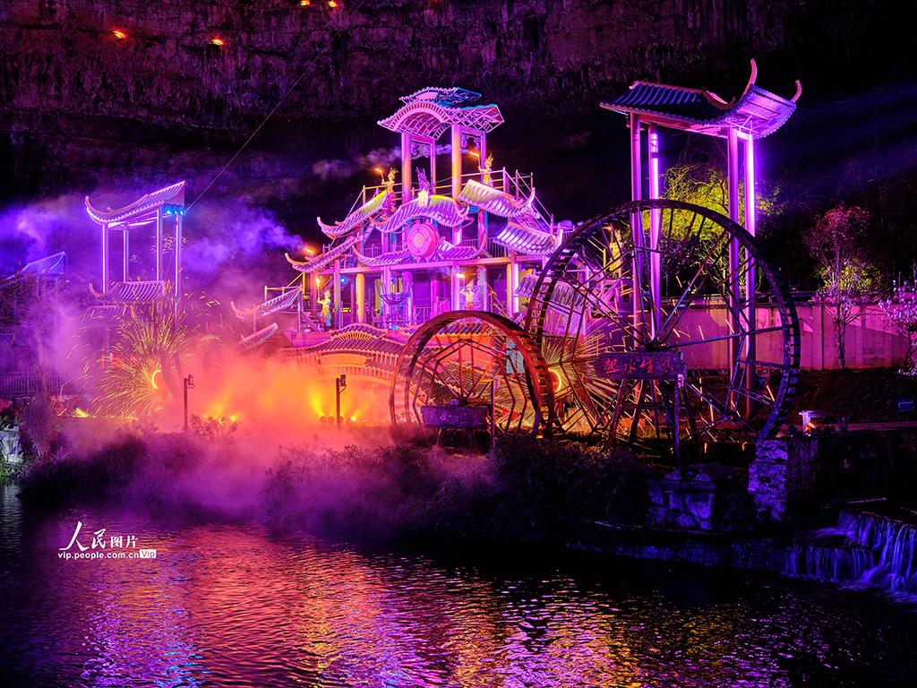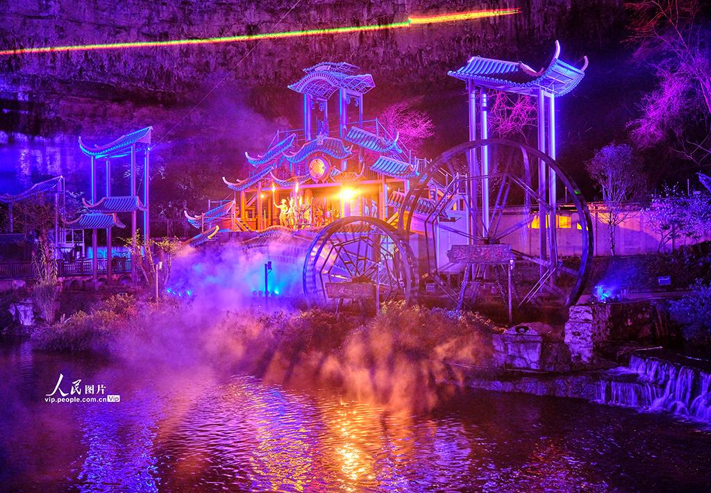 2026年3月24日晚,游客在湖北宜昌观看三峡车溪大型行浸式山水夜游演艺《梦回车溪》。该演出以车溪山水和土家集市为全景舞台,以浪漫爱情传说为主线,围绕“神、人、爱”三大主题,串联“神兽迎宾”“老街灯火”“十里红妆”等场景,将巴楚民俗文化与现代演艺科技深度融合。
