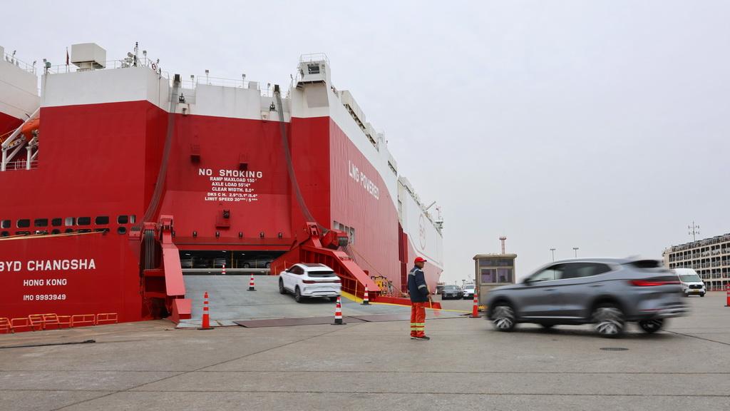 在上海外高桥的海通汽车滚装码头上,一辆辆崭新的国产汽车源源不断地驶入停靠在码头上的汽车滚装船。“十四五”期间,海通码头从外高桥“一港”,拓展到了位于上海临港的南港码头与位于江苏的太仓码头,形成了“两港三地”的协同格局。该码头现已开通12条国际汽车滚装航线,航线网络覆盖全球135个国家和地区的295个港口。2026年1至2月,海通公司“两港三地”合计完成吞吐量77.02万辆,同比增长27.71%。新华社记者 方喆 摄
