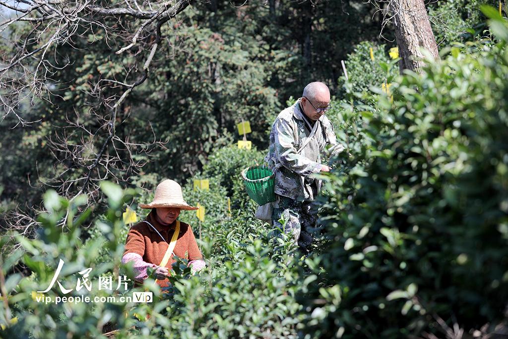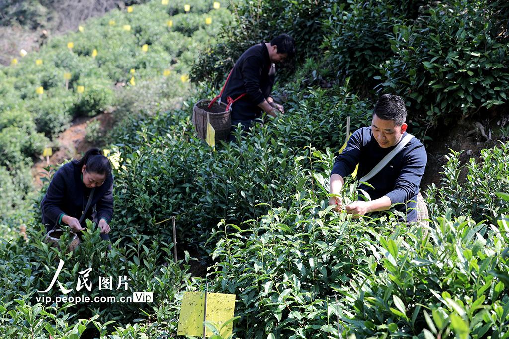 2026年3月25日,在安徽黄山徽州区富溪乡的黄山毛峰核心产区,茶农正抢抓晴好天气采摘明前茶,供应市场。樊成柱摄