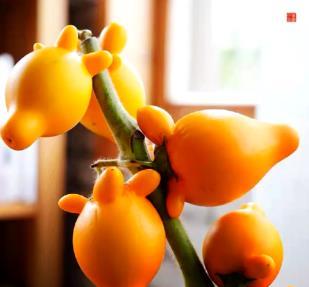 朋友来家里做客,赠我一盆乳茄。初见这种植物,便被它的外形和色彩惊艳了。它果实形状奇异特别,基部有三五个乳状突起,宛如纤细的手指或弯弯的牛角,呈倒梨状,色泽金黄耀眼,格外惹人喜爱。