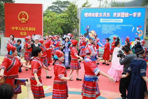 南宁市良庆区蟠龙社区开展“嘹啰欢歌三月三 民族团结一家亲”民族团结宣传月主题活动(陈晔/摄)