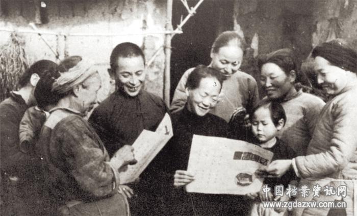 1951年11月,重庆市第三区光明村金刚坡乡农民领到新式结婚证书时的场景。