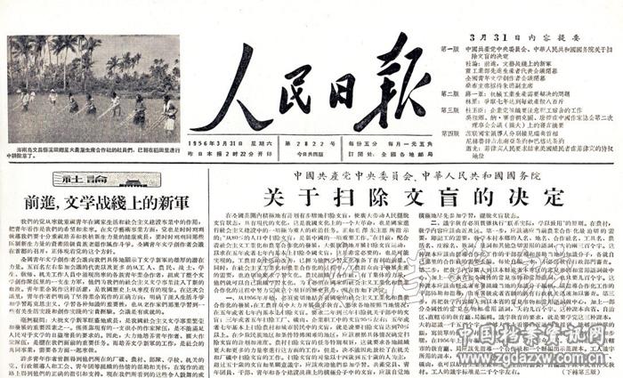 1956年3月31日,《人民日报》刊登的《关于扫除文盲的决定》。 中央档案馆藏