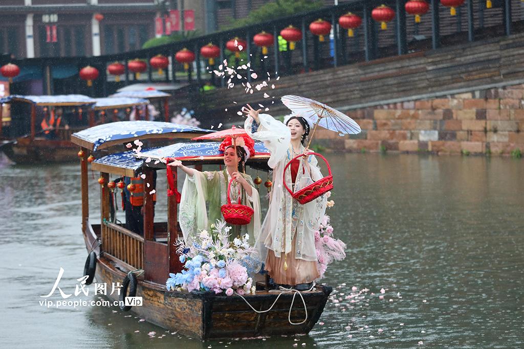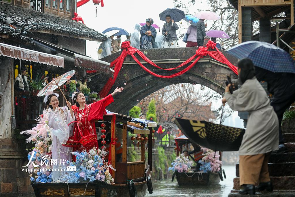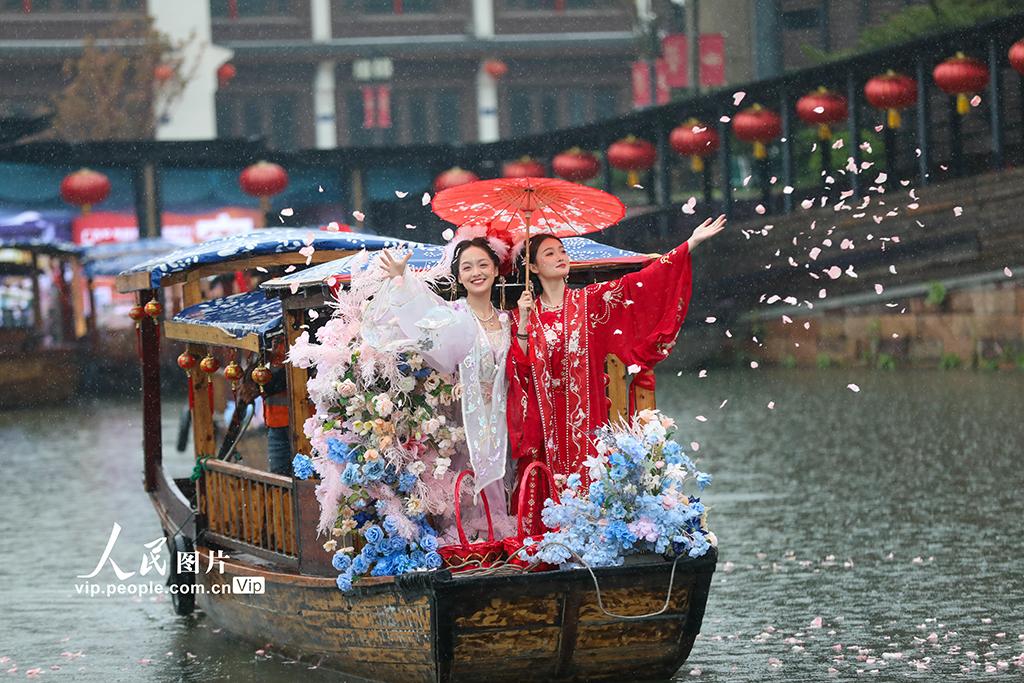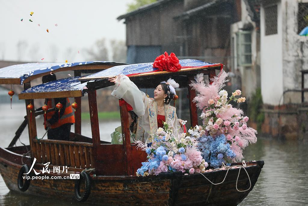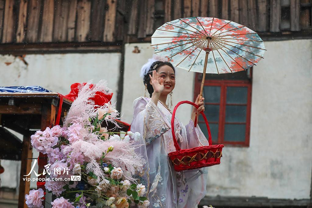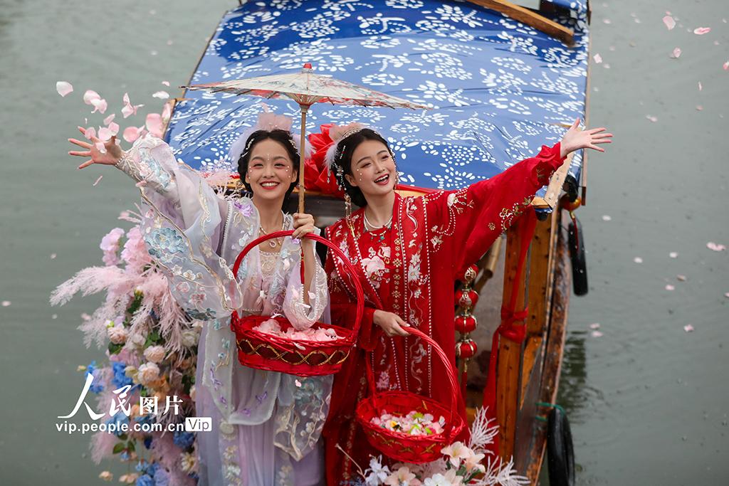2026年4月3日,浙江湖州德清县新市镇第28届蚕花庙会如期举办。蚕花姑娘乘船巡游,在水上抛洒蚕花,沿袭古礼祈福纳祥,祈愿蚕桑丰收。白羽摄