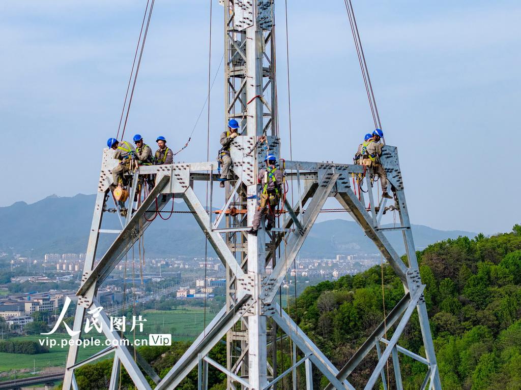 2026年4月5日,安徽芜湖市繁昌区孙村镇,安徽送变电工程有限公司施工人员在高空中加紧建设甘肃-浙江±800千伏特高压直流输电工程。