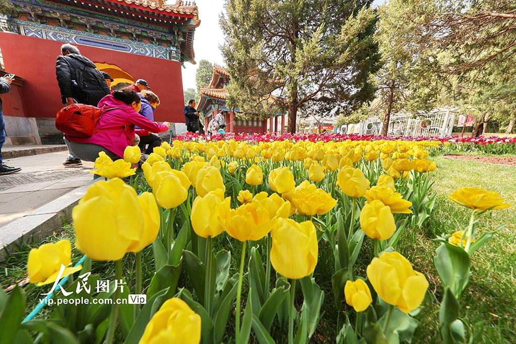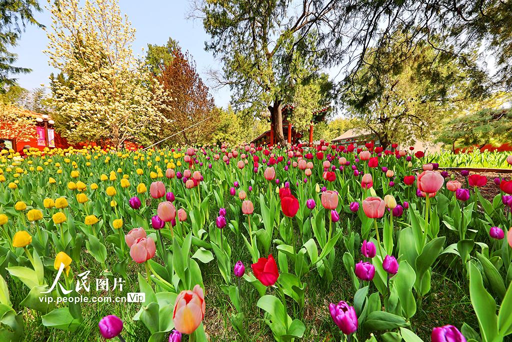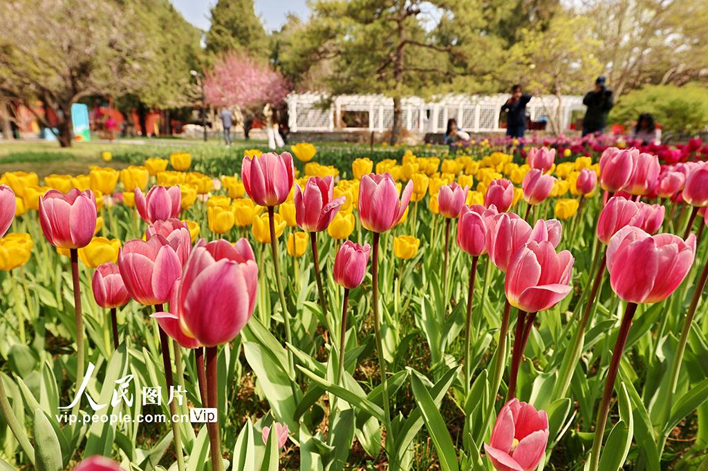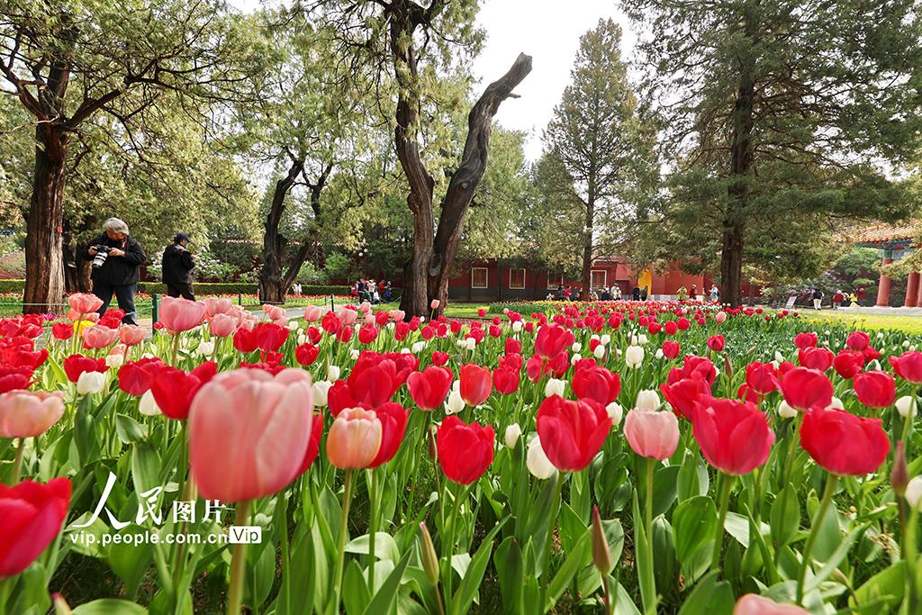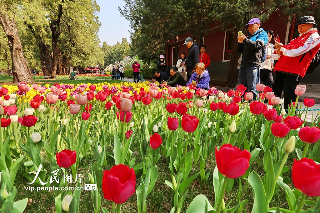 2026年4月8日,北京中山公园鲜花盛开,园内多处地栽郁金香娇艳绽放,吸引市民游客前来踏青赏花、拍照留念。刘宪国摄