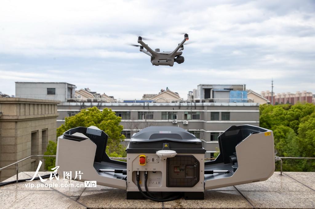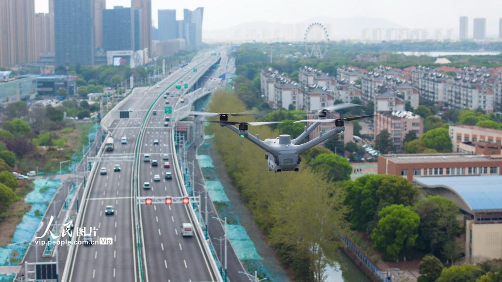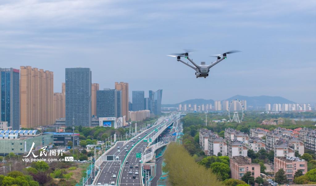 2026年4月9日,在江苏省张家港市南二环快速路上空,一架无人机正在执行环卫保洁巡查任务,可引导环卫车辆精准清理,提升环卫工作效率。陈佳琪摄
