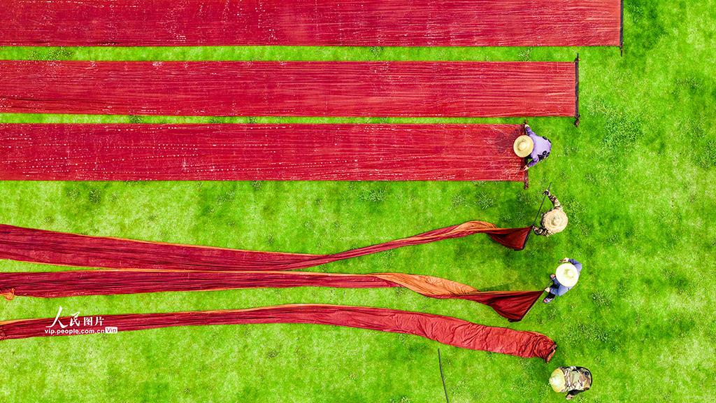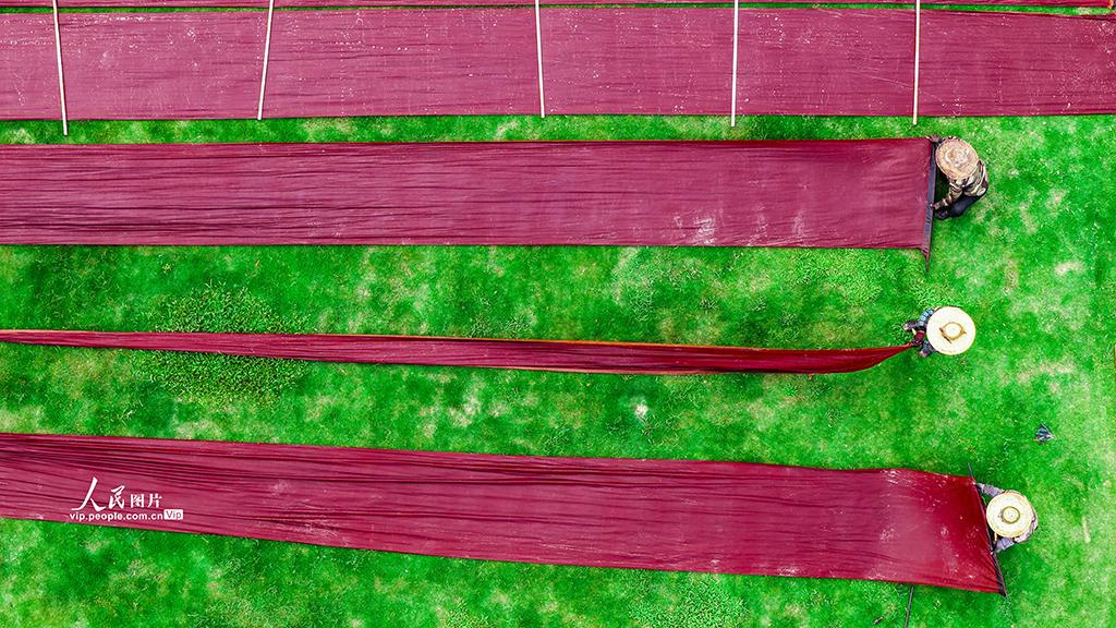 2026年4月11日,在广西梧州龙圩区广平镇淑里村一家丝绸企业的草坪上,工人们正利用晴好天气晾晒香云纱。
