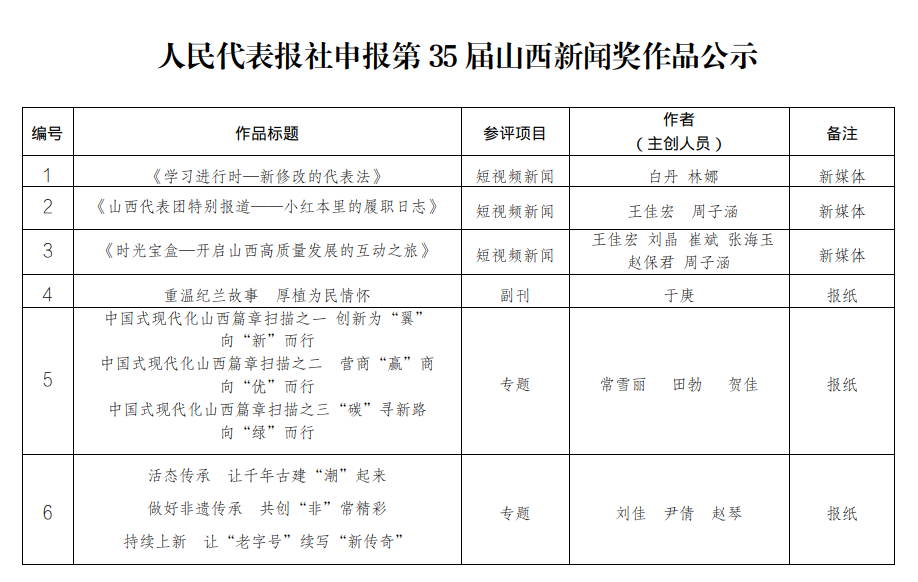 按照山西省新闻工作者协会《关于开展第35届山西新闻奖评选的通知》要求和《山西新闻奖评选办法》相关规定,经自主申报、编辑记者民主推荐、评委会推荐程序,经研究决定,以下作品拟推荐申评第35届山西新闻奖,现予以公示。公示期为5个工作日。如有异议可将意见书面报至总编室。(新闻作品附后)