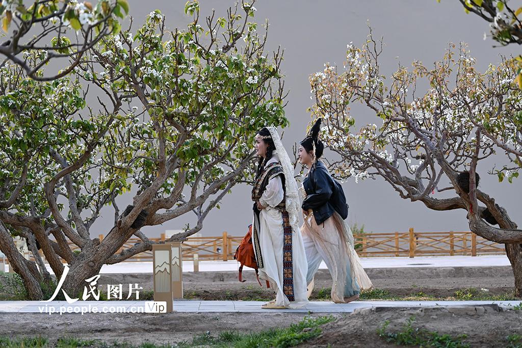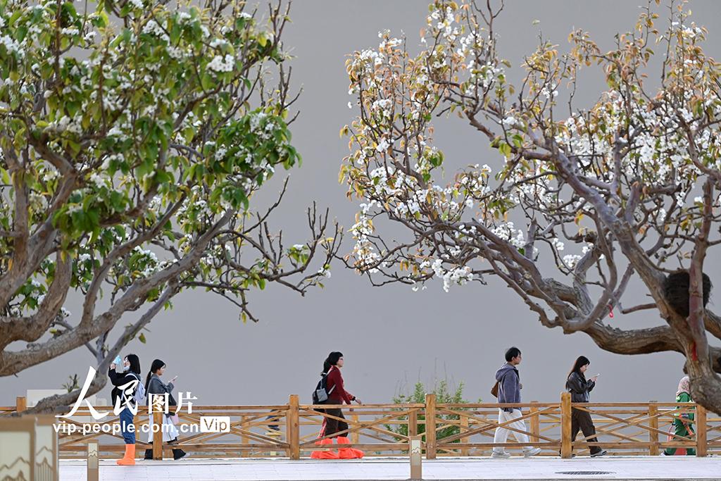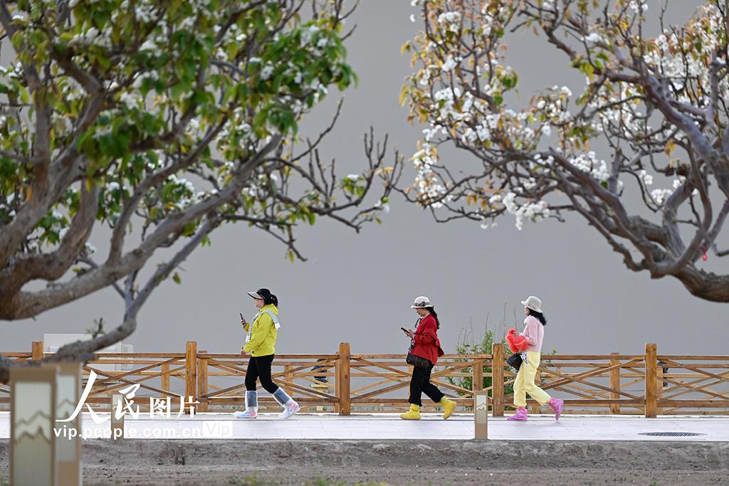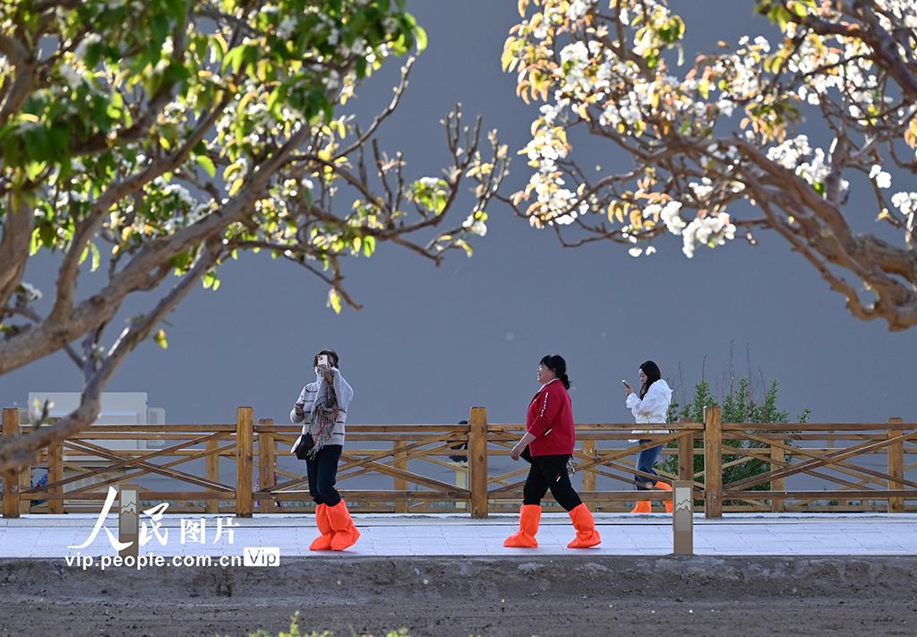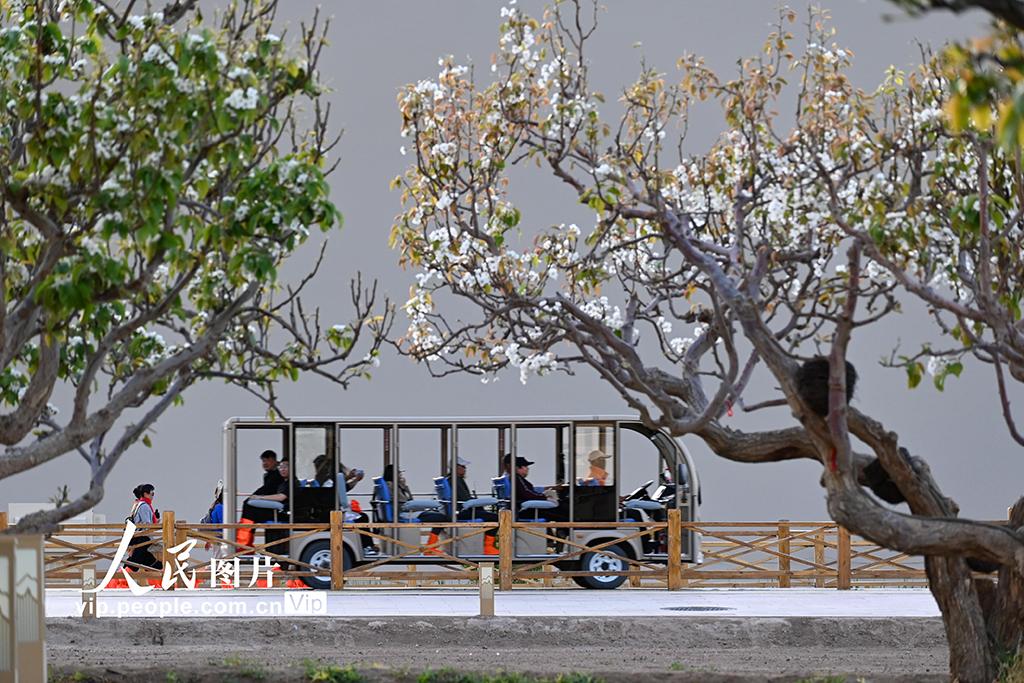 四月中旬,甘肃敦煌鸣沙山下繁花似锦,游客畅游大漠,尽享明媚春光。王斌银摄