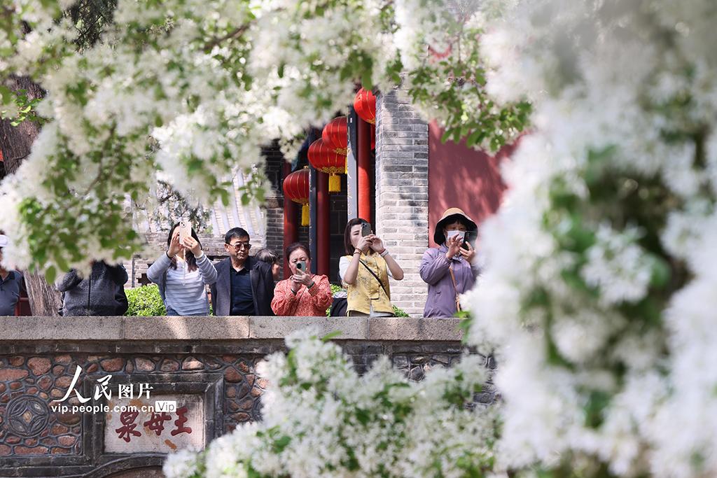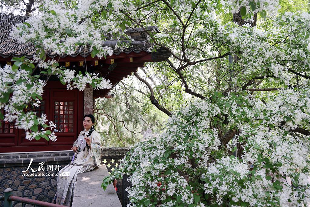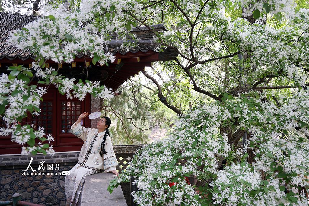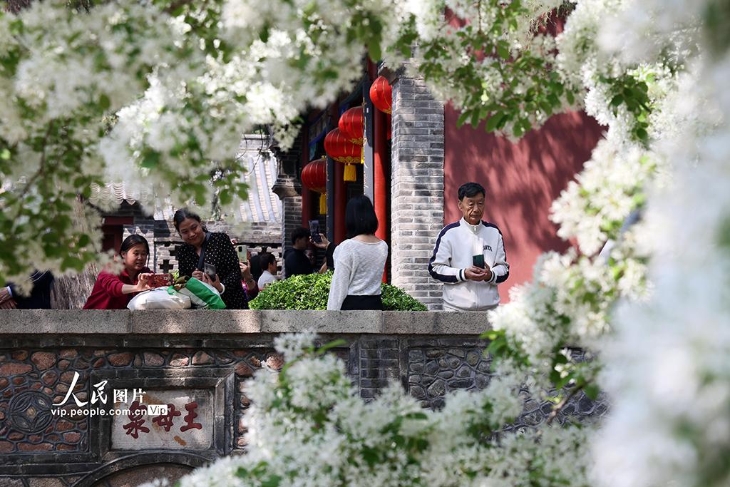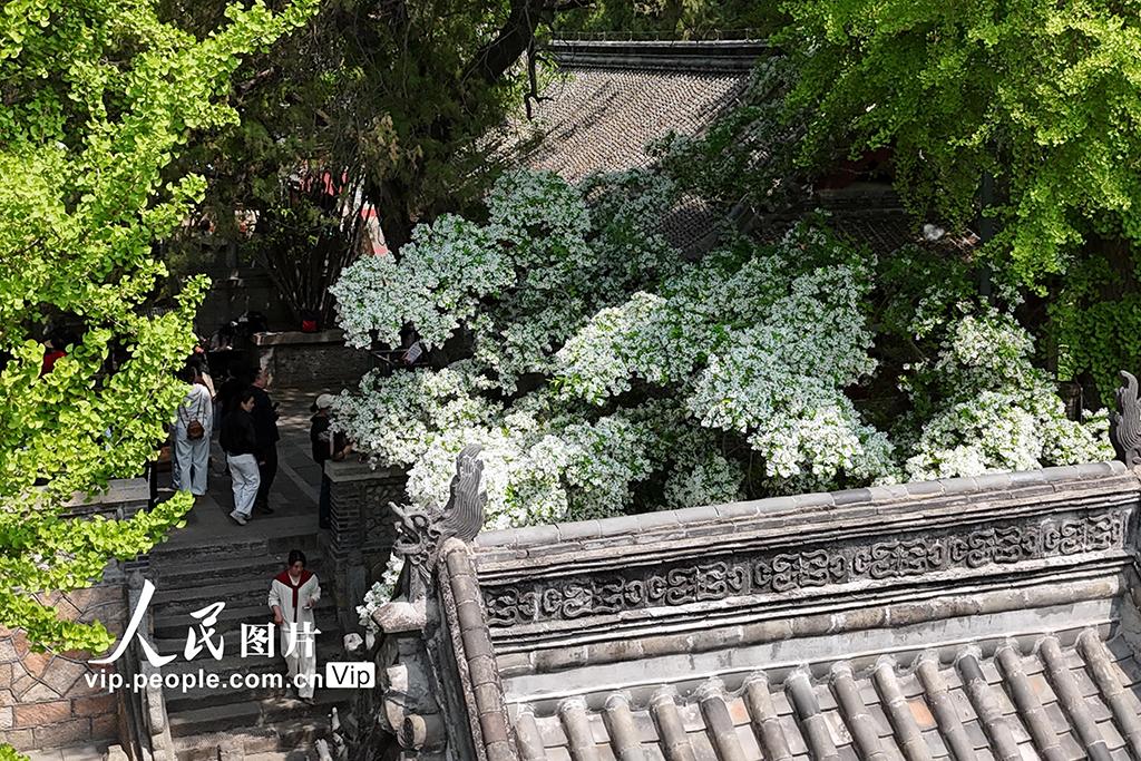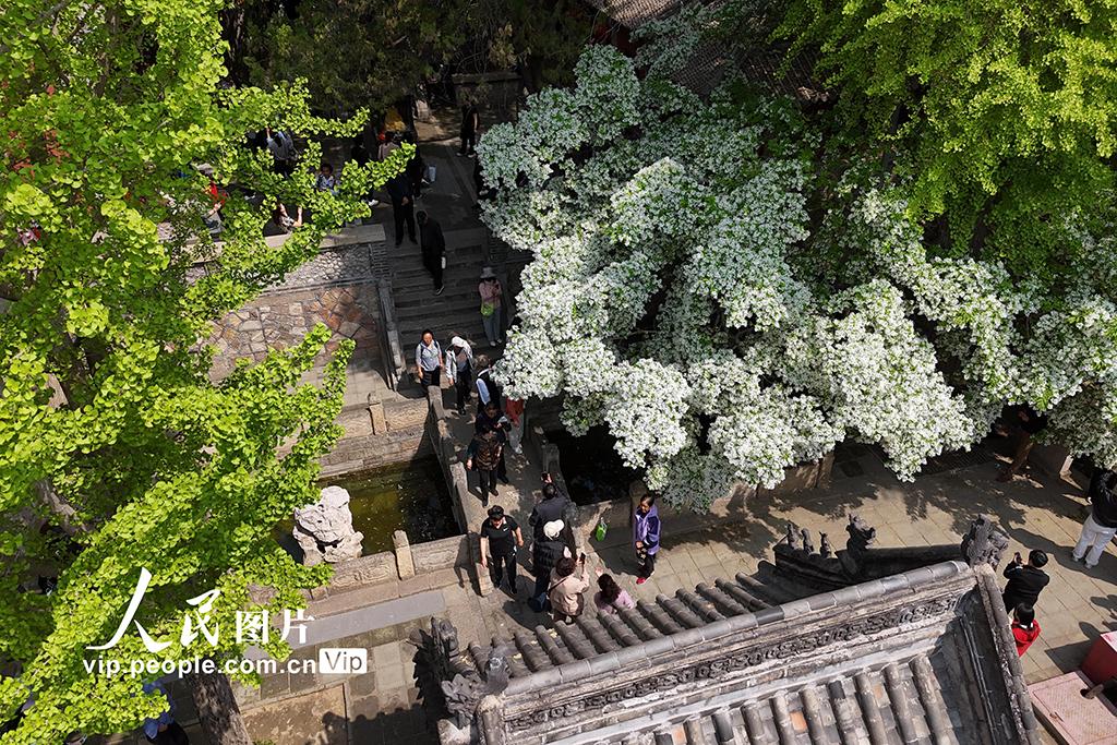 2026年4月15日,山东泰安泰山王母池百年流苏古树进入盛花期,满树白花如雪覆枝,吸引众多游客前来赏景打卡。陈阳摄