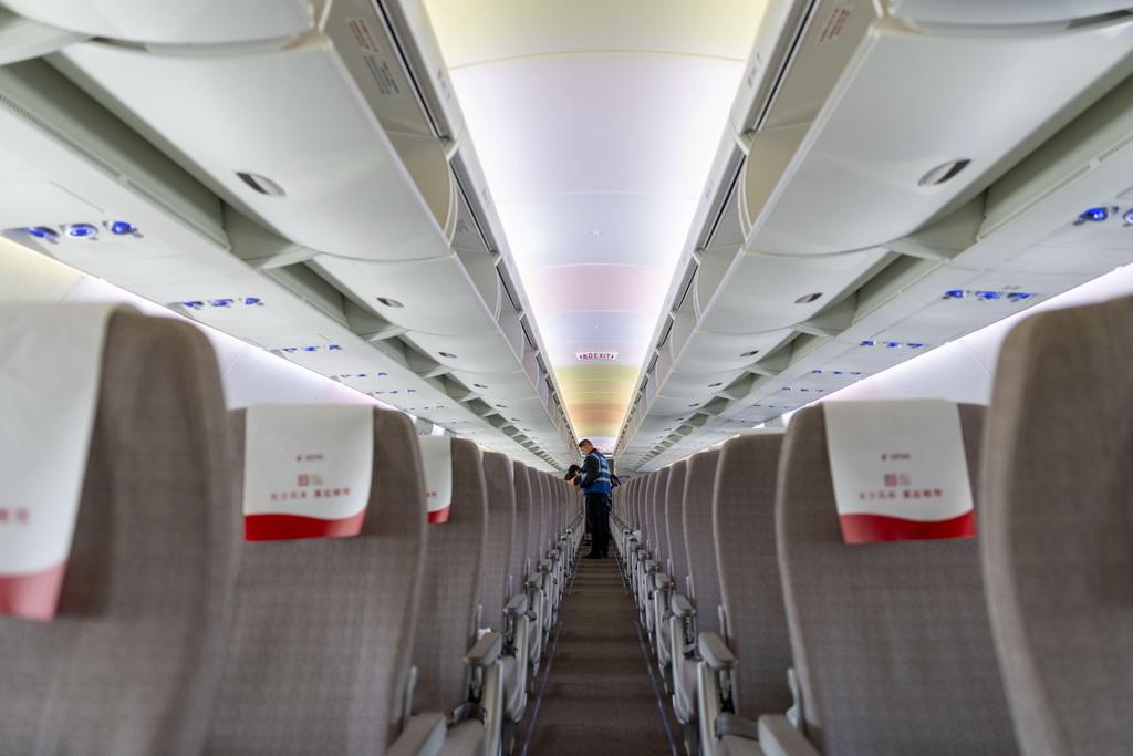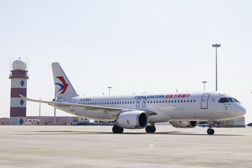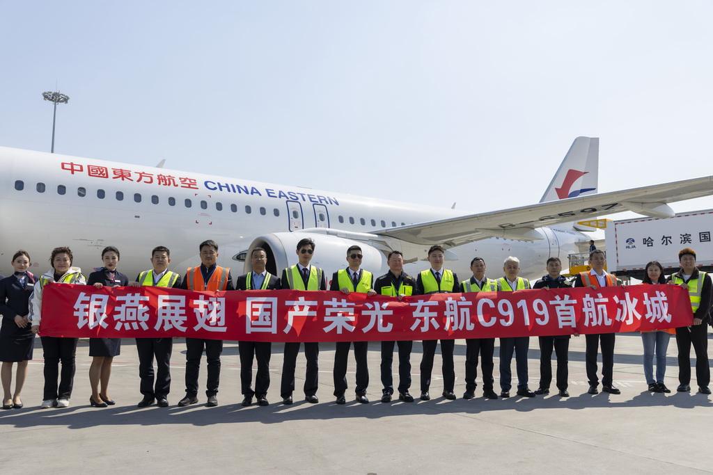 4月15日11时56分,搭载140名旅客的MU5631航班平稳降落在哈尔滨太平国际机场,东方航空C919国产大飞机哈尔滨—上海航线成功首航,标志着国产大飞机正式投入东北至长三角核心航线。新华社记者 张涛 摄
