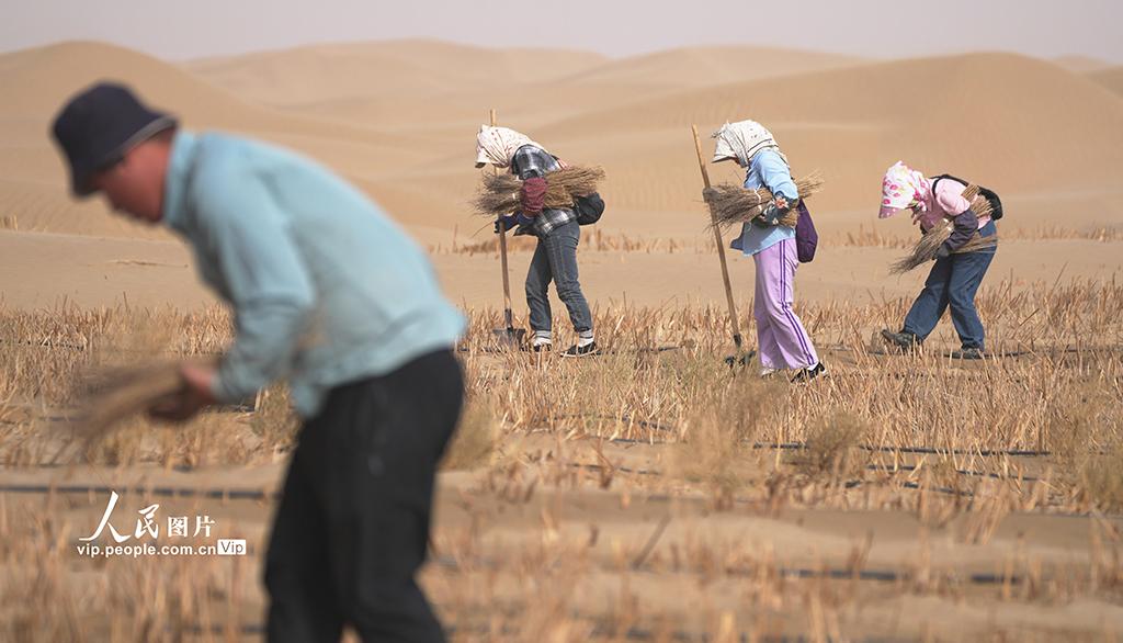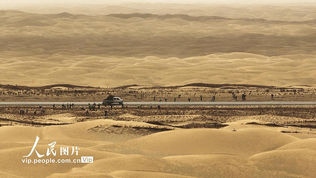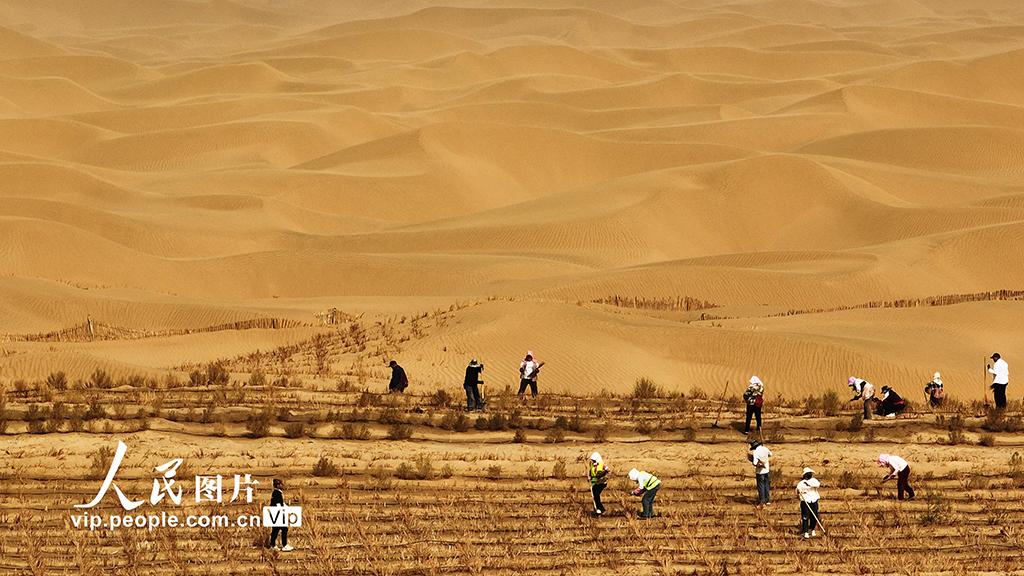 2026年4月14日,新疆生产建设兵团第二师38团职工在38团至塔中沙漠公路两侧栽植梭梭。