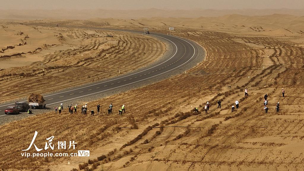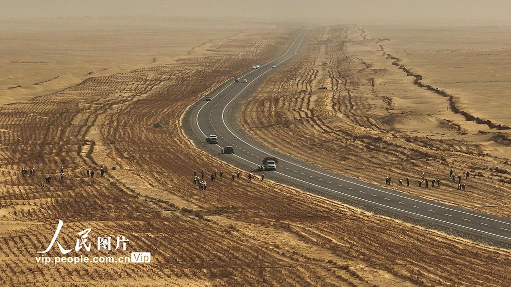 该沙漠公路于2025年上半年建成通车后,沿线陆续种植了红柳、梭梭、胡杨等耐旱树种,以减轻风沙对公路的侵袭,形成总面积约1.75万亩的生态防护林带。王志清摄