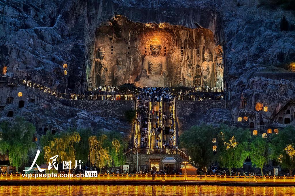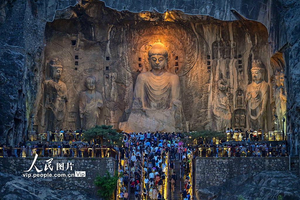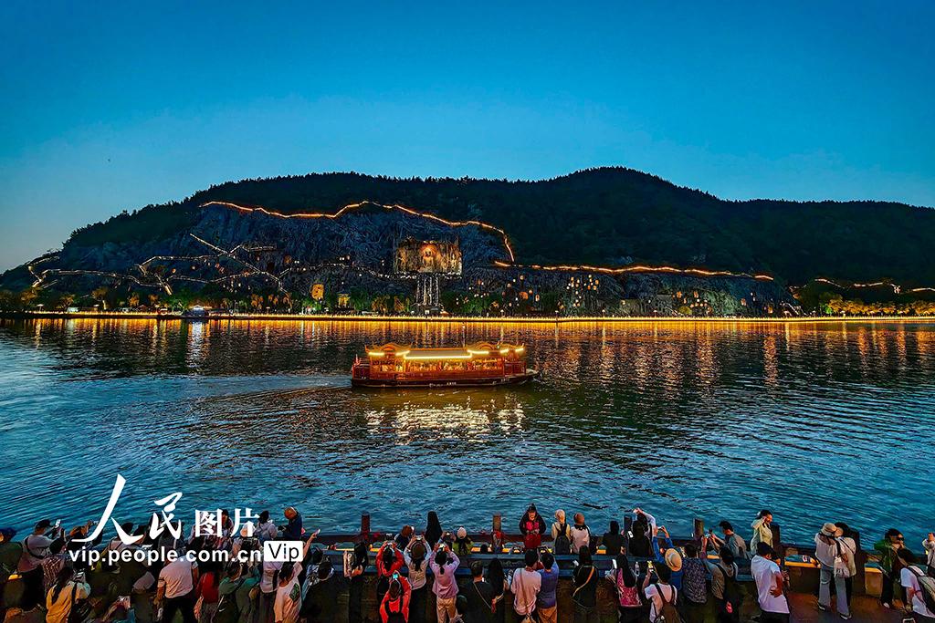 2026年4月17日晚,河南洛阳,游客在龙门石窟游玩,感受精美绝伦的石刻艺术。李卫超摄