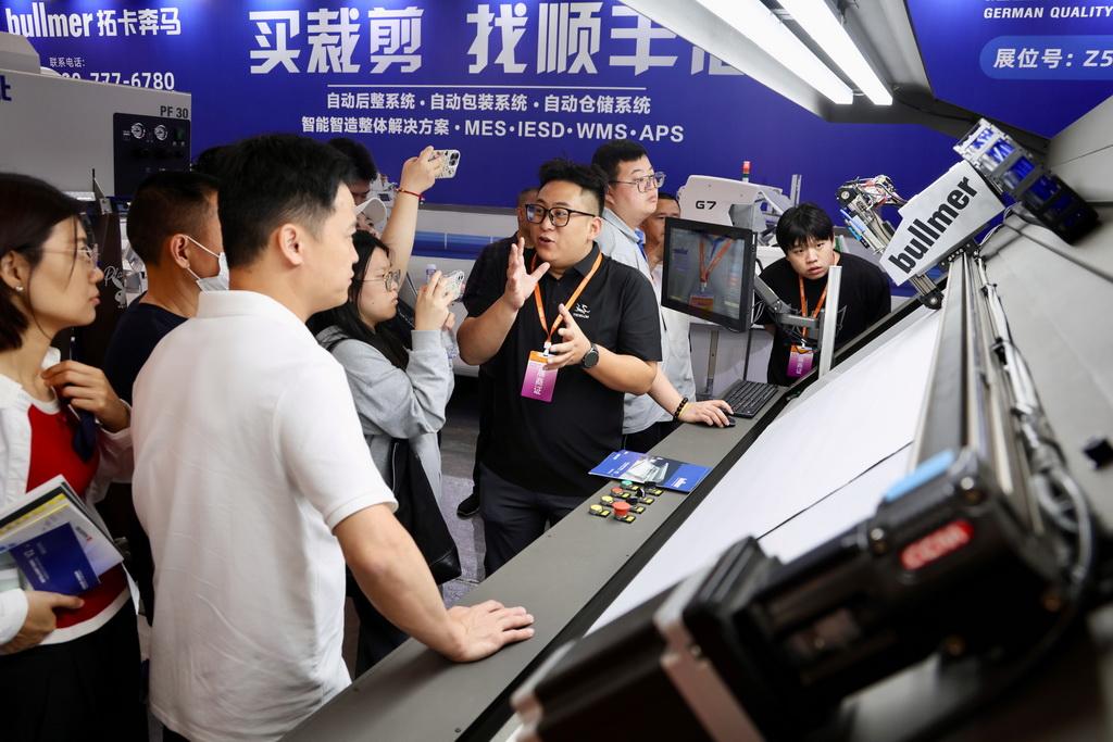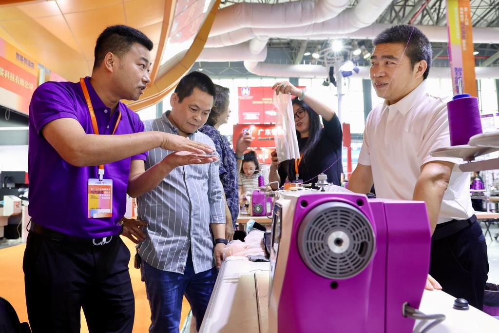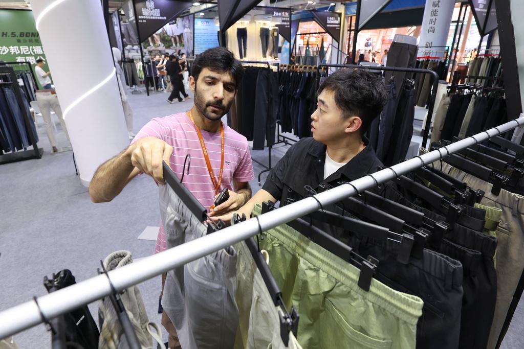 4月18日,第二十八届海峡两岸纺织服装博览会暨全球男装供应链展在福建石狮服装城展览艺术中心开幕。本届展会以“链通全球 潮领未来”为主题,打造规格更高、业态更全、影响力更广的纺织服装全产业链盛会。新华社记者 姜克红 摄