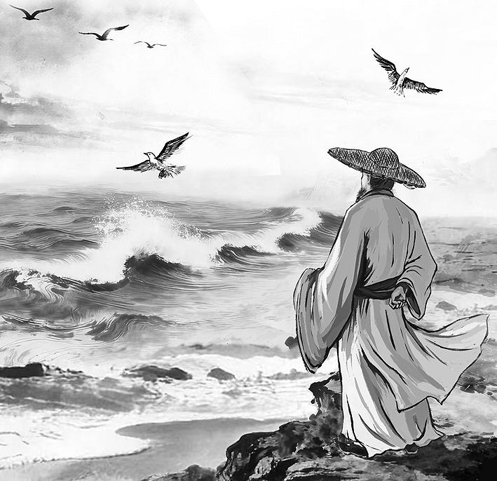 庄子可谓东方第一个放声歌唱海洋的哲人,他所描述的大海以及与天地精神相往来的鲲鹏形象,构成了中国先秦时代最磅礴的海洋之歌:“秋水时至,百川灌河。泾流之大,两涘渚崖之间,不辩牛马。于是焉河伯欣然自喜,以天下之美为尽在己。顺流而东行,至于北海,东面而视,不见水端。于是焉河伯始旋其面目,望洋向若而叹曰……”这片神秘的海域,庄子有时也叫北溟,那儿潜居着长达几千里的巨鱼。当然,在庄子心中,更令人神往的是南溟。和儒家相比,道家更向往大海,因大海的气息更接近道家浑涵汪茫的理想。