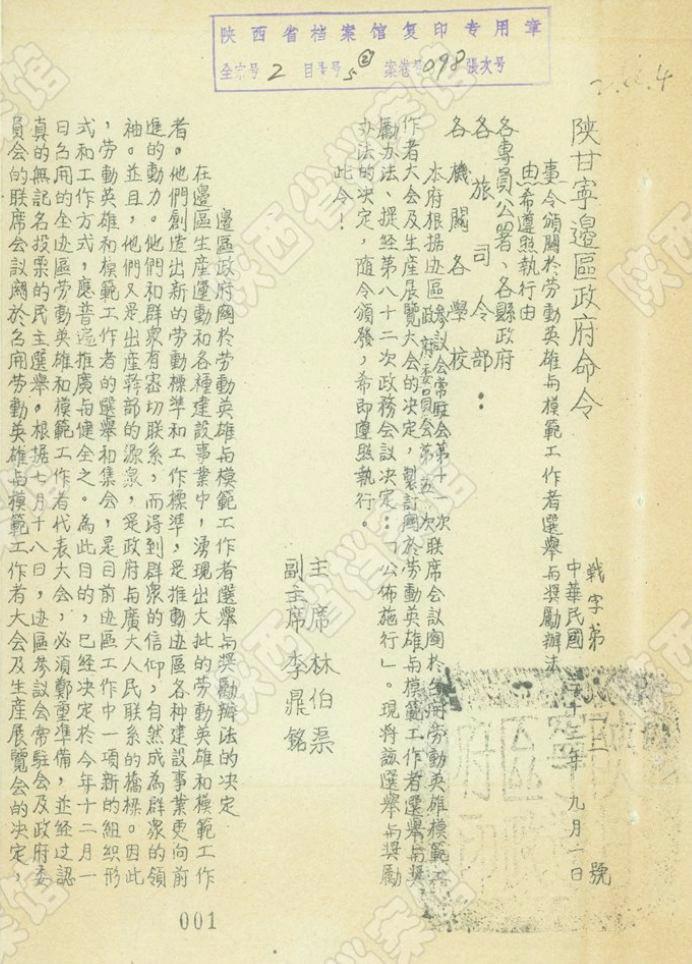 1944年9月,陕甘宁边区政府颁发《关于劳动英雄与模范工作者选举与奖励办法》(陕西省档案馆藏)