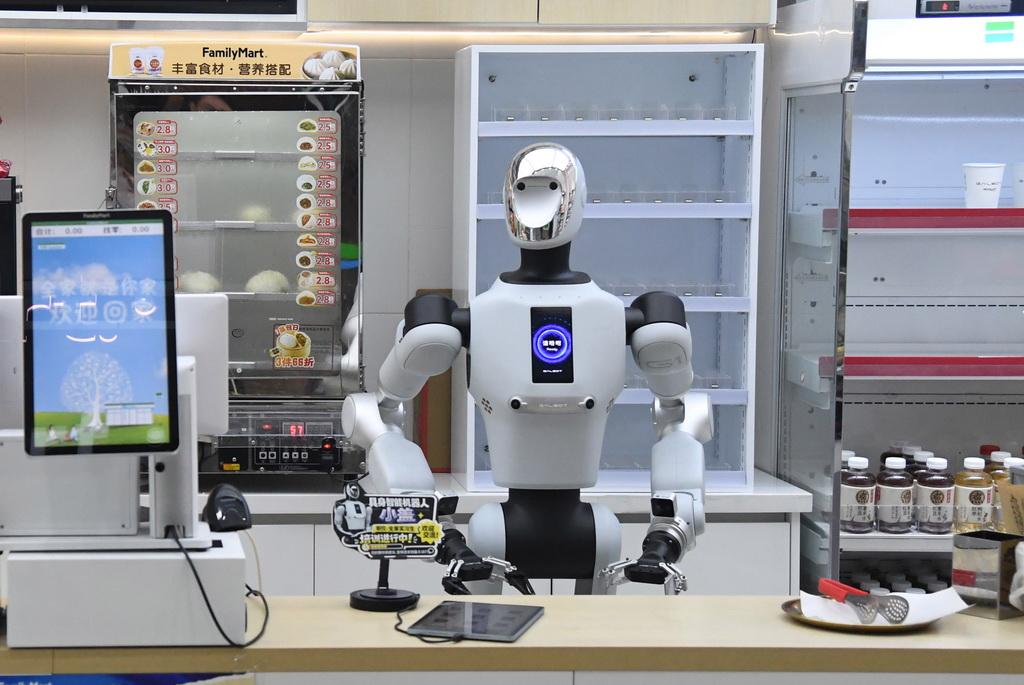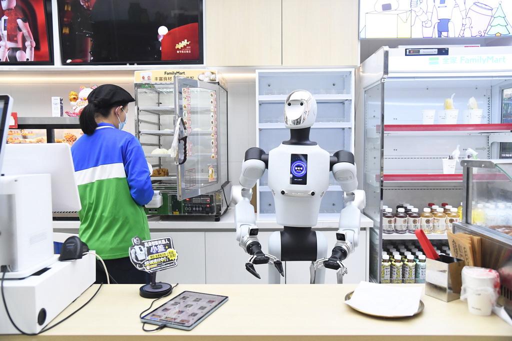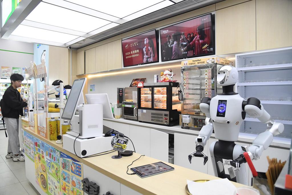 近日,一款具身大模型机器人进驻北京市海淀区中关村大街一座大厦内的便利店,开启常态化服务。据了解,该款机器人可以在便利店中完成迎宾互动、通过语音交互响应商品查询、促销咨询等揽客接待需求。与此同时,它还可以自主完成冷饮、熟食等商品的取放与递交,助力提升顾客购物体验。新华社记者 任超 摄