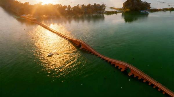 滇池之畔,草海之上,全国首座自动化开合浮桥蜿蜒如巨龙,与秀美湖景相映成趣。