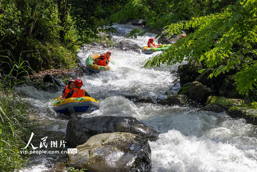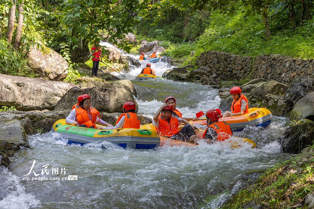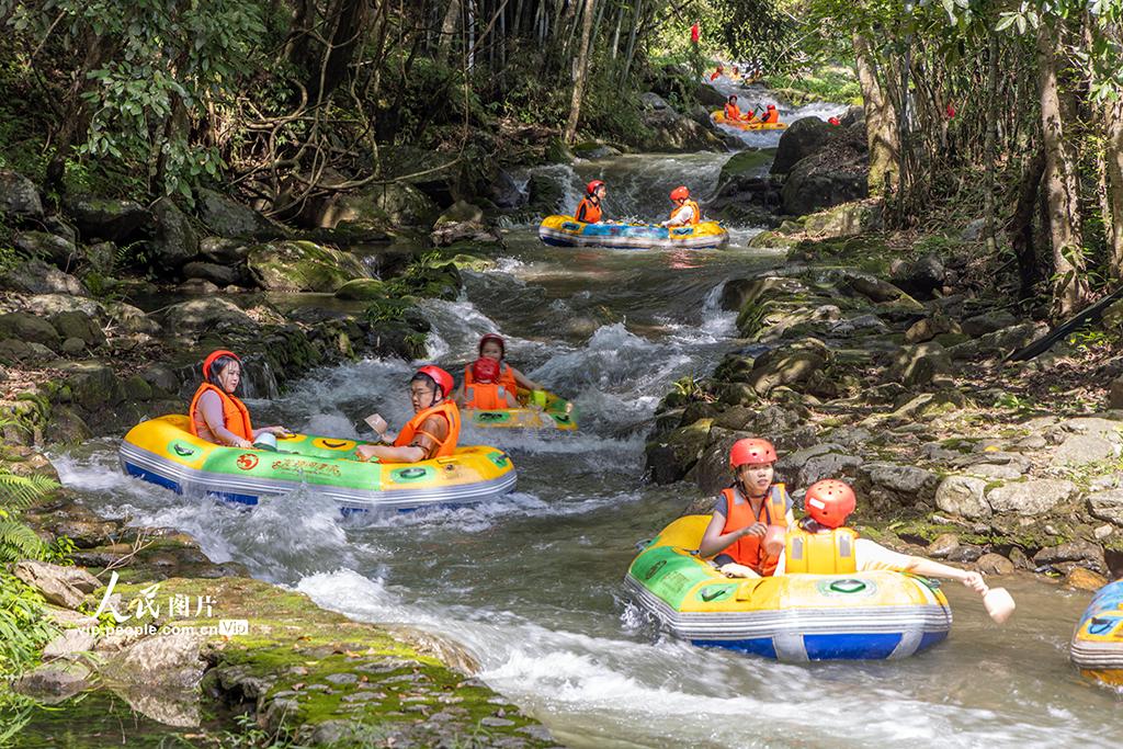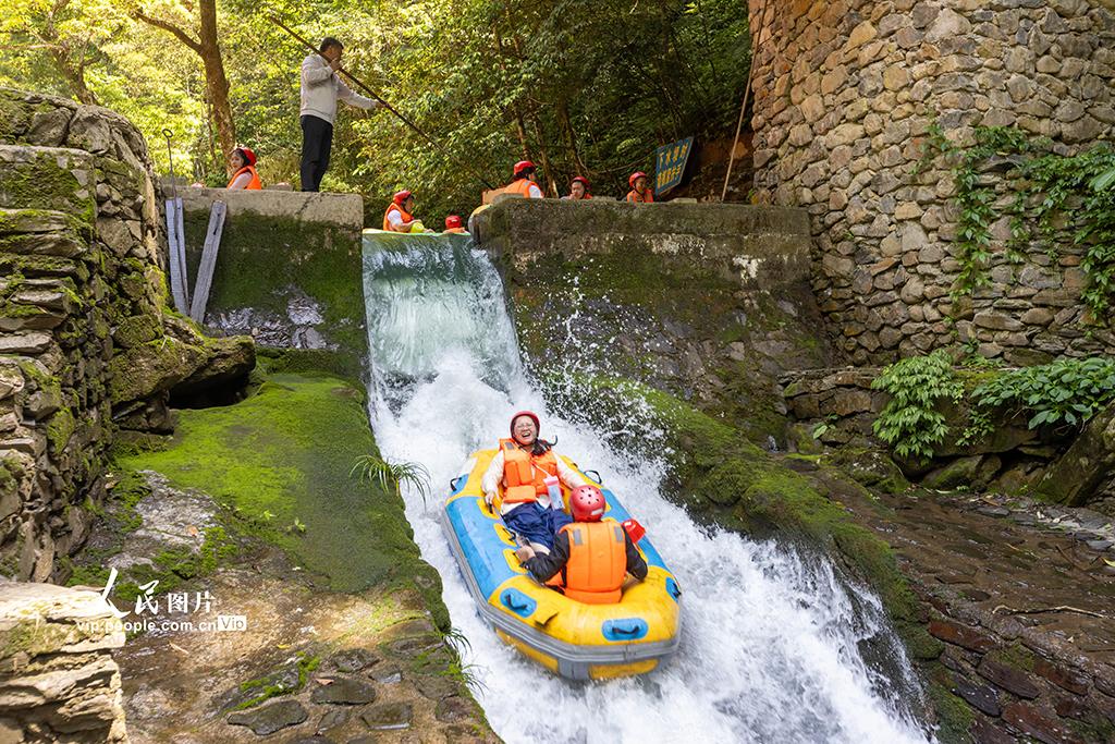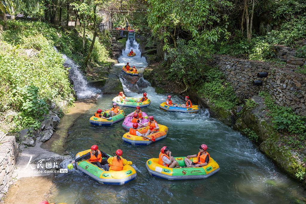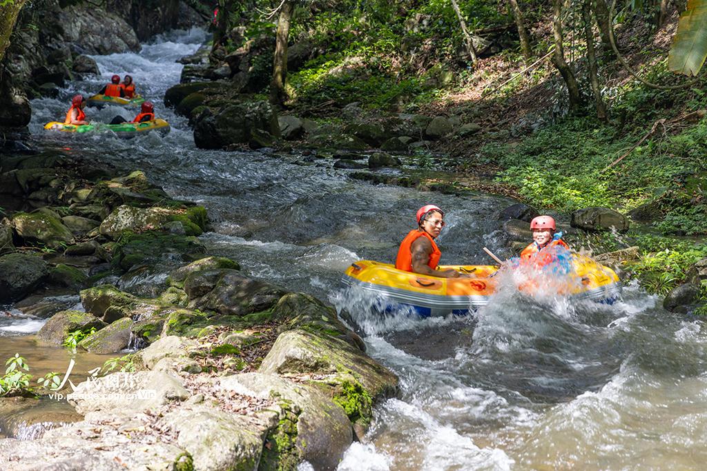 2026年4月25日,位于广西桂林市阳朔县兴坪镇的龙颈河景区,游客正在体验惊险刺激的漂流。黄胜林摄
