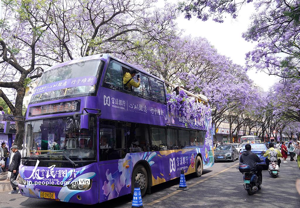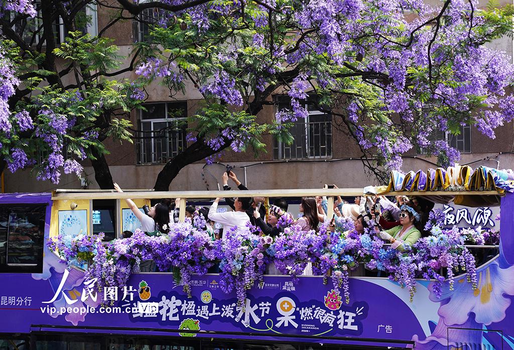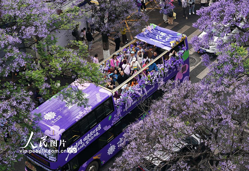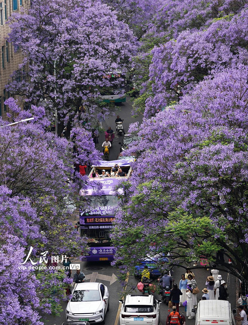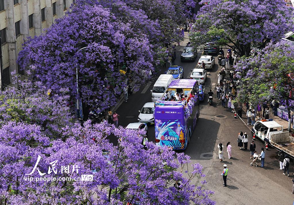 连日来,云南昆明教场中路的蓝花楹竞相绽放,吸引众多市民游客前来打卡,共赴这场紫色花海之约。梁志强摄