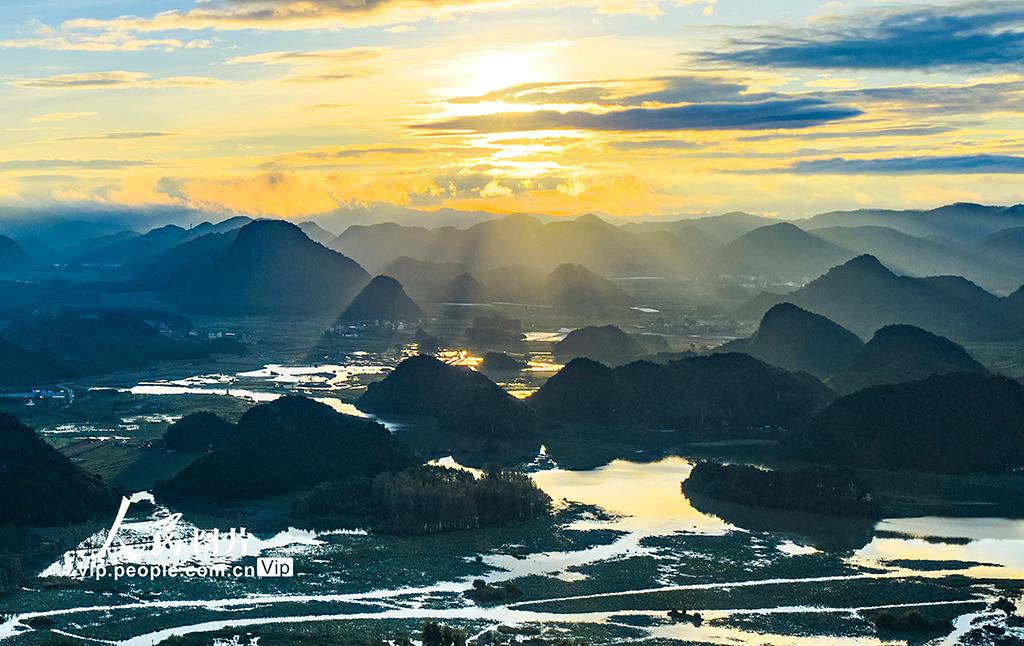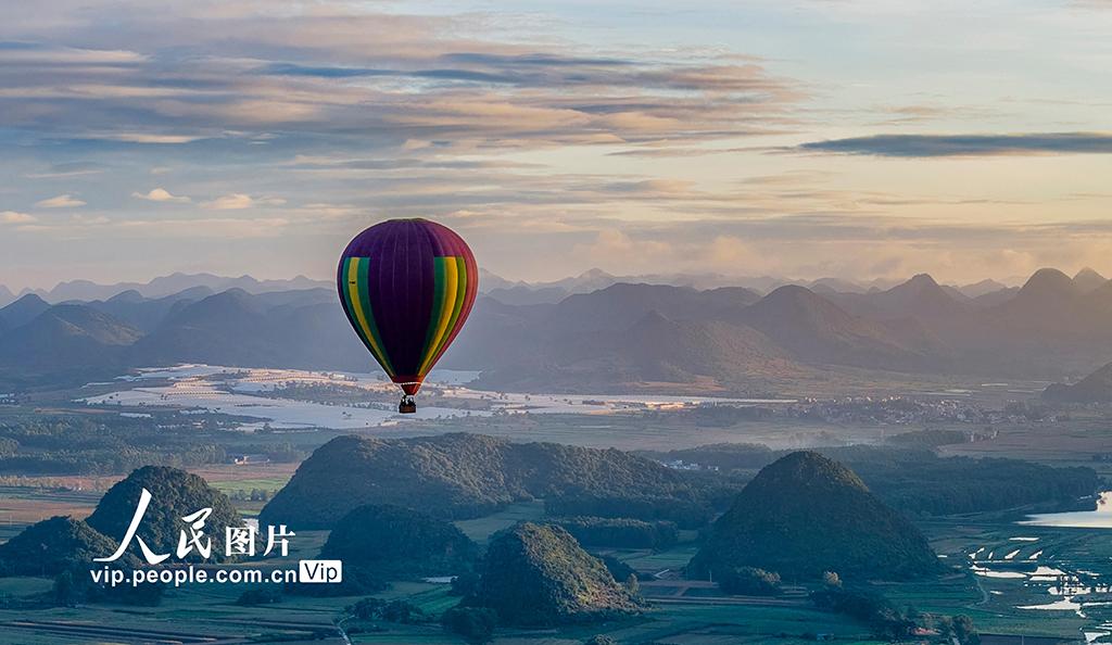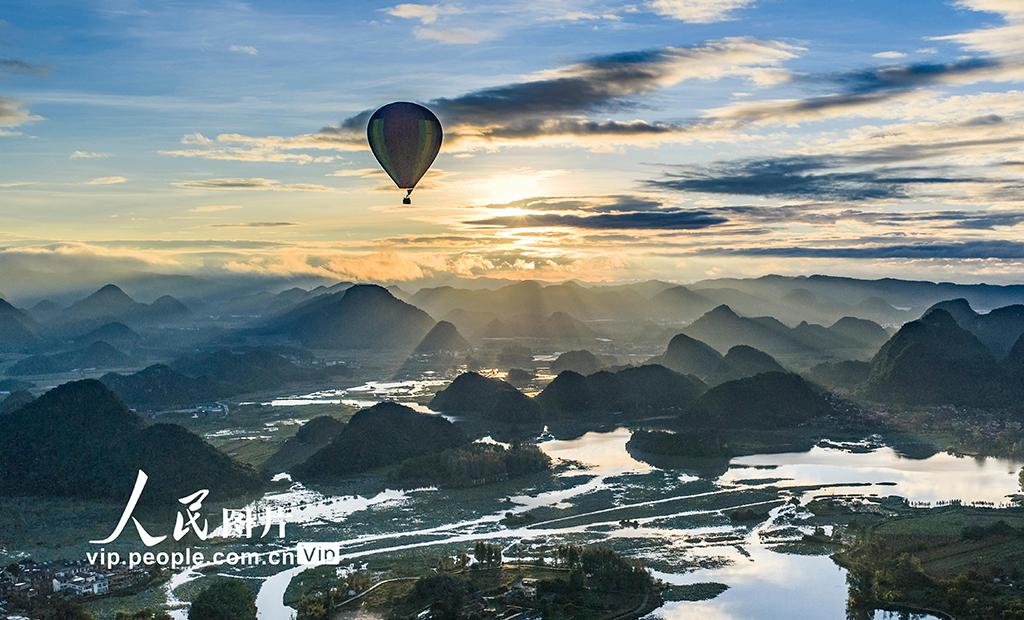 大美云南处处是景。在云南省丘北县普者黑国家5A级旅游景区,独特的喀斯特山水田园风光吸引众多游客前来,亲近山水,沉浸自然。游客可乘热气球迎朝阳升空,将壮美的山水田园全景尽收眼底,令人心旷神怡。熊平祥摄