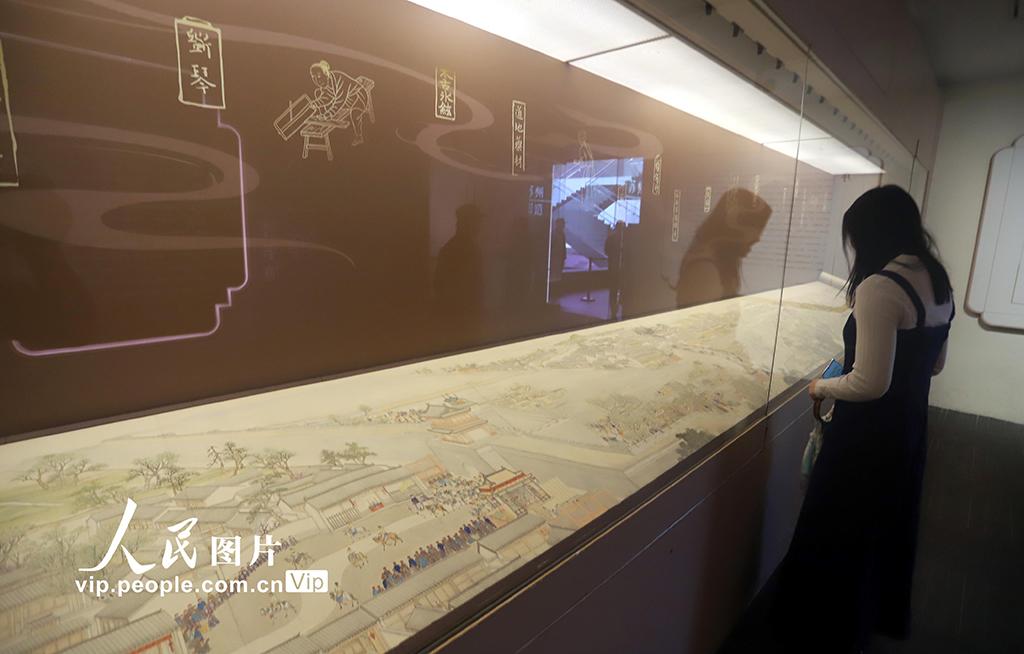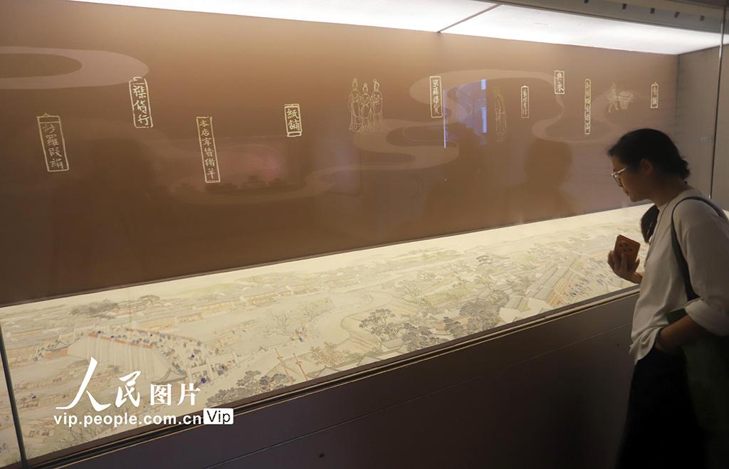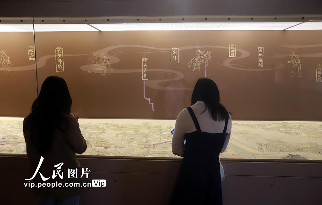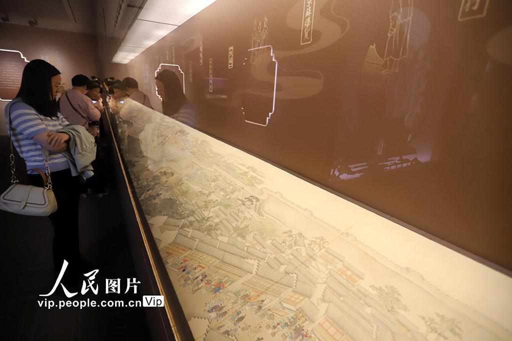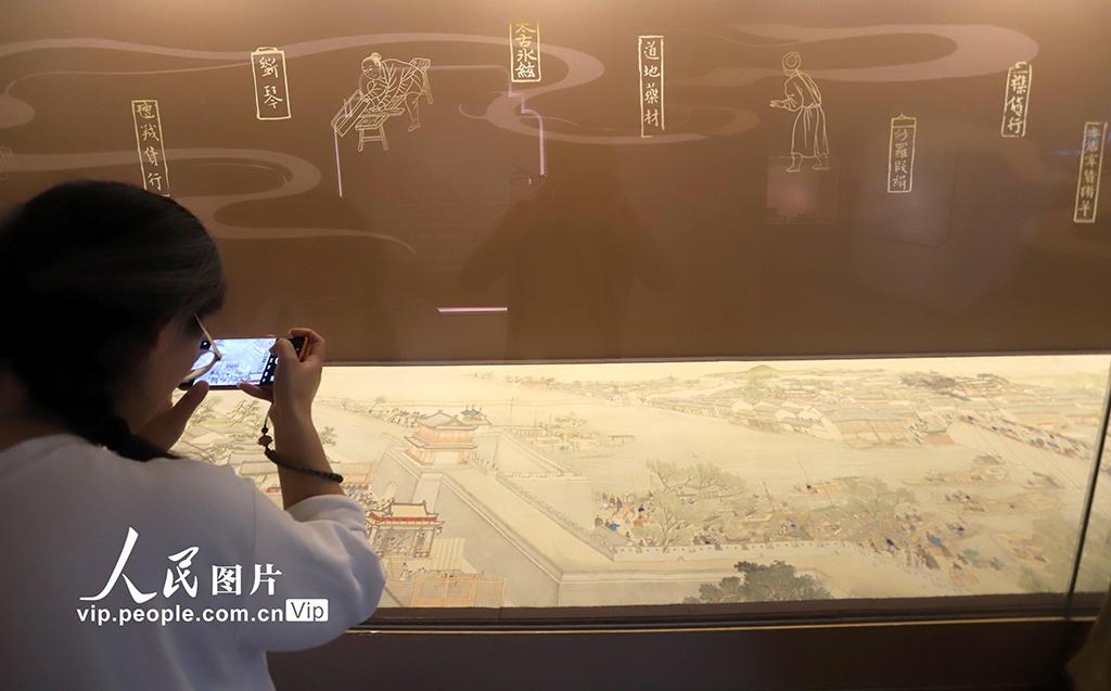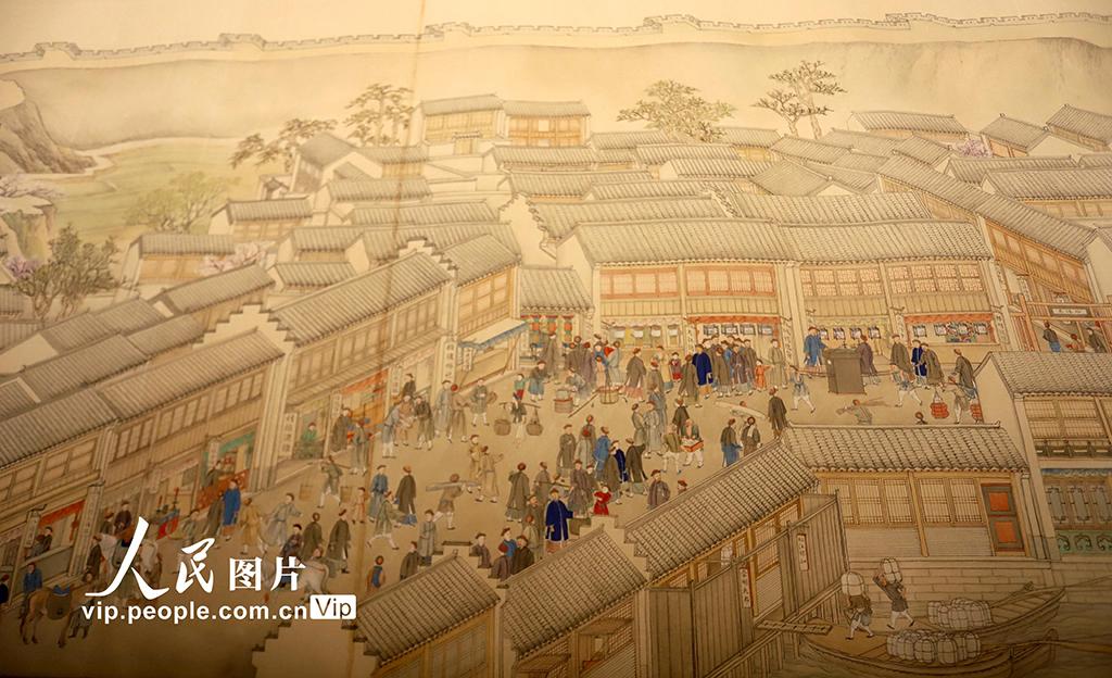 本次展出的第六卷《驻跸姑苏》以大运河为线索,自北向南铺展。画卷始于苏州府长洲县的南望亭,沿运河南下,分段连续描绘了浒墅关、枫桥、虎丘、阊门、万年桥、胥门至苏州织造府一带的繁华景象。王建康摄