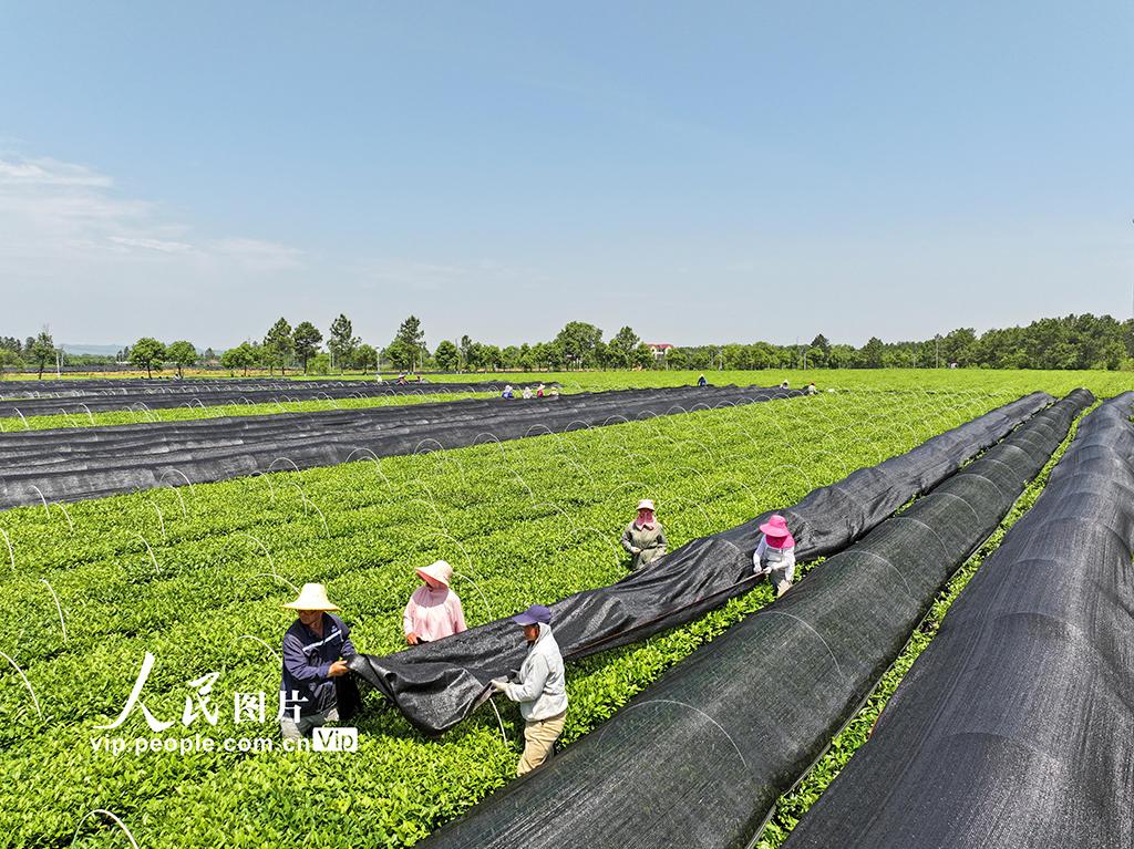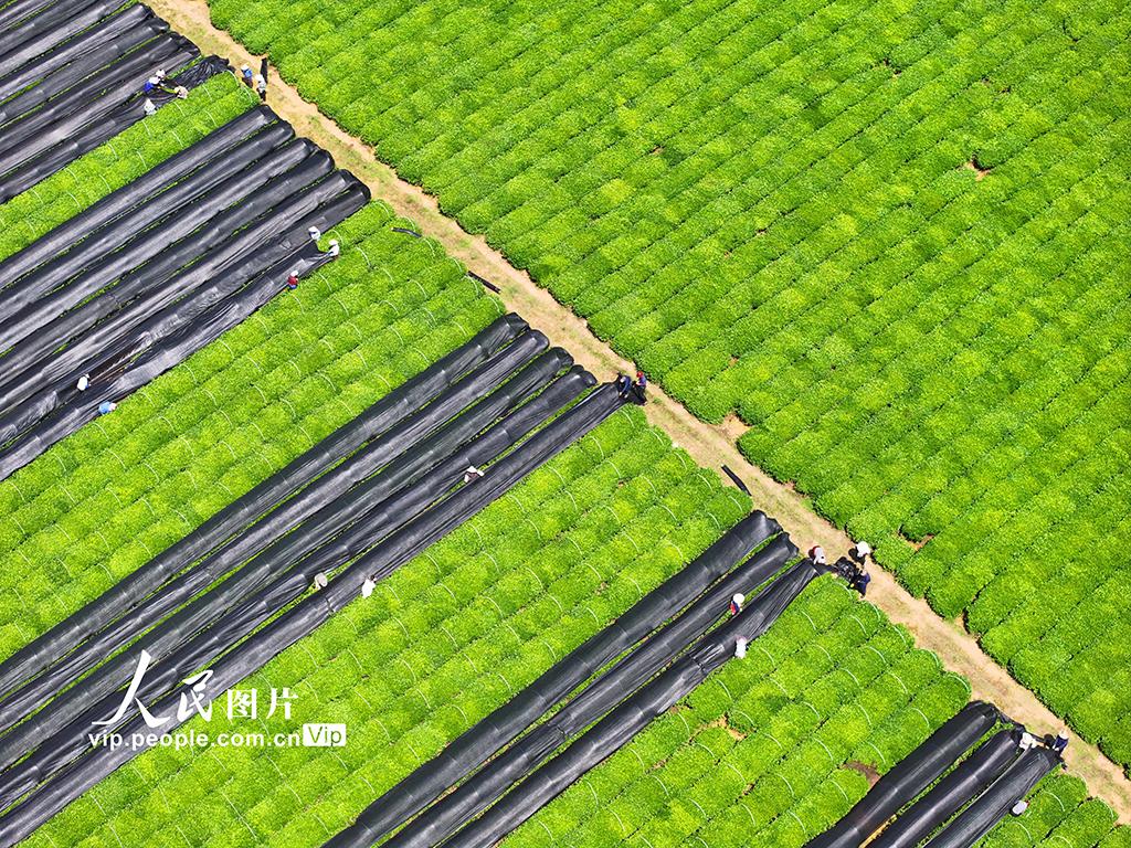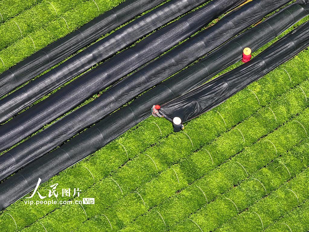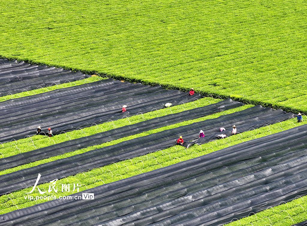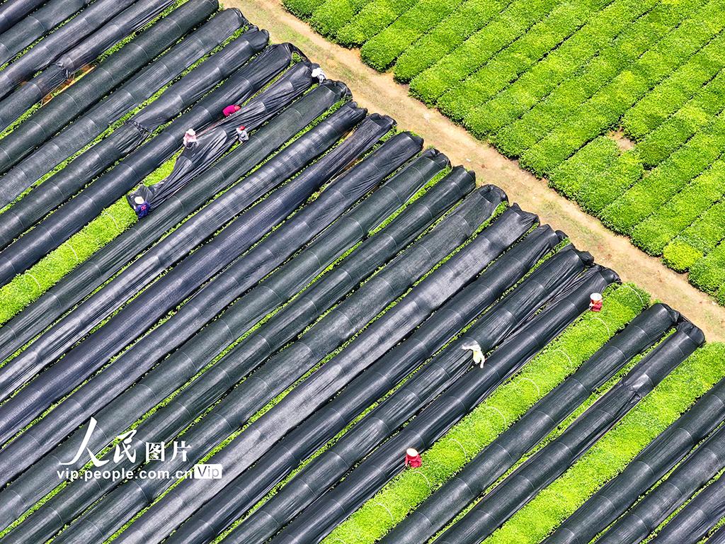 2026年4月27日,在江西吉安泰和县泰和垦殖场生态茶园,茶农正在为茶树覆盖遮阳网,改善茶叶生长环境。泰和县推广茶树覆盖遮阳网技术,有效减轻光照强度,降低茶树与地表温度,调节小气候,从而提升茶叶中叶绿素与茶氨酸含量,促进茶叶品质提升。邓和平摄